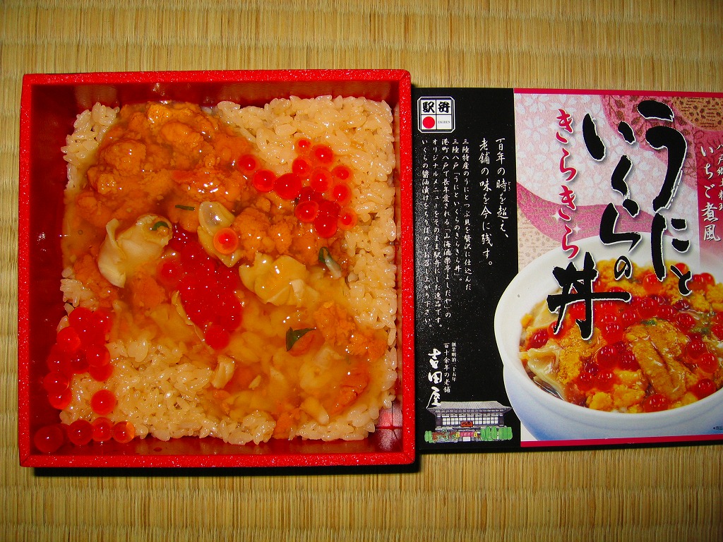 2006(平成18)年10月7日に発売。小柄な正方形の容器に透明なふたをして、しおりと割りばしを置き、中身調理例を写真で示す紙枠にはめる。中身は味付飯のみが敷かれ、イクラ醤油漬のカップと、ウニとツブ貝を混ぜたあんかけの袋が入る。カップと袋の中身を茶飯の上にぶっかけて完成する調理系駅弁。
