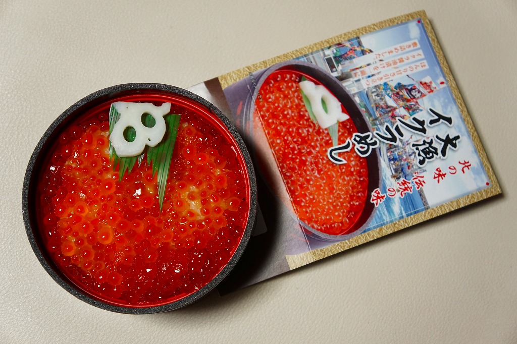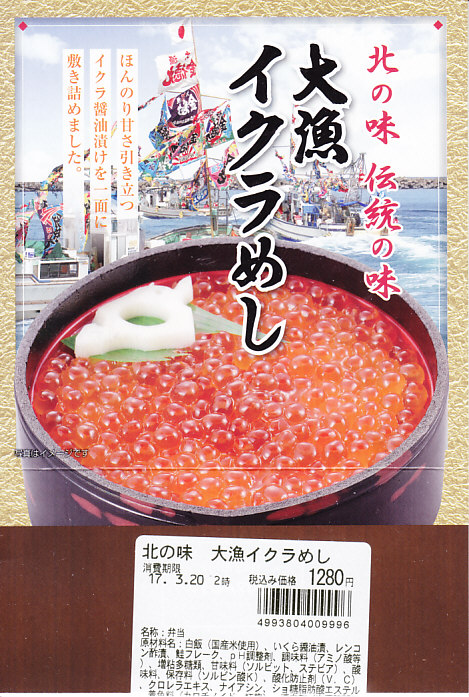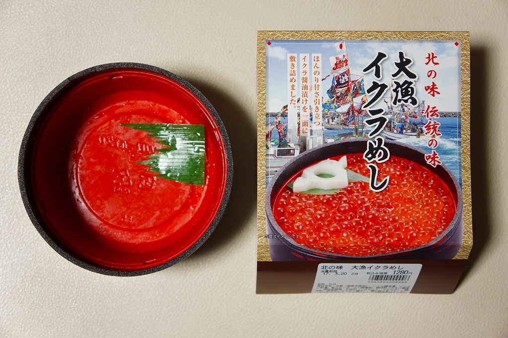 2016(平成28)年10月30・31日に、全国のイトーヨーカドーで大々的に販売。黒く丸い容器に白飯を詰め、イクラでそのすべてを覆い、小さなレンコンを添えるイクラ丼。小樽駅などの名義で催事場に出てくるタイプと同じもの。これが駅弁マークのないスリーブの記載によると「北の味 伝統の味」なのだとか。主にスーパーの駅弁大会で、まれに東京駅で、ごくまれに八戸駅で売られた模様。2018年までの販売か。