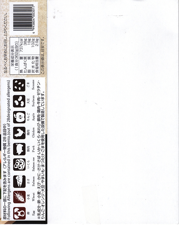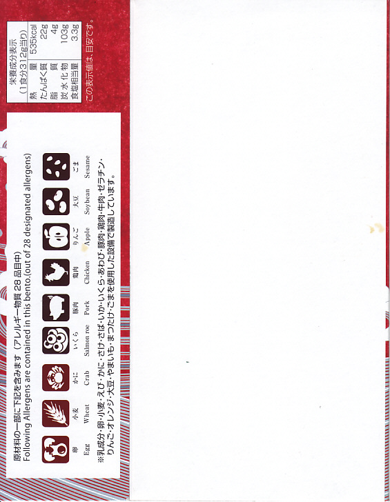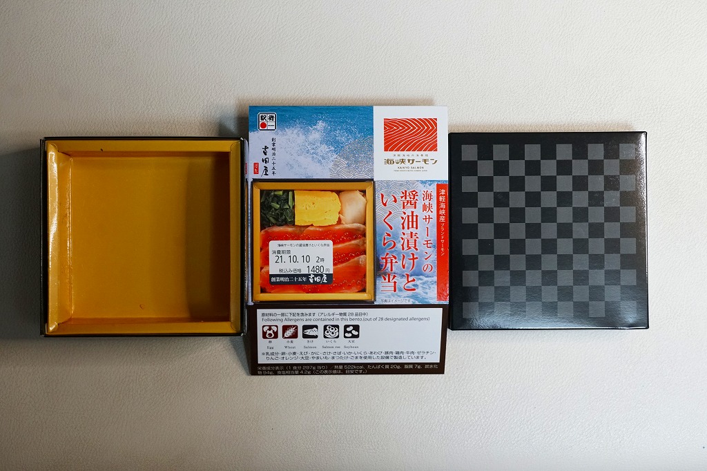 2015(平成27)年夏の新作だろうか。白御飯をサーモンのハラスとイクラと鮭フレークで覆い、柴漬けと玉子焼と小松菜を添える。中身はトロトロおいしいのだが、パッケージの写真がとても美しすぎるため、これに到底及ばない中身の見栄えで、初対面の印象が悪くなる。2020(令和2)年10月に「田酒粕漬けこぼれイクラとハラス焼き弁当」へ値上げとリニューアル。