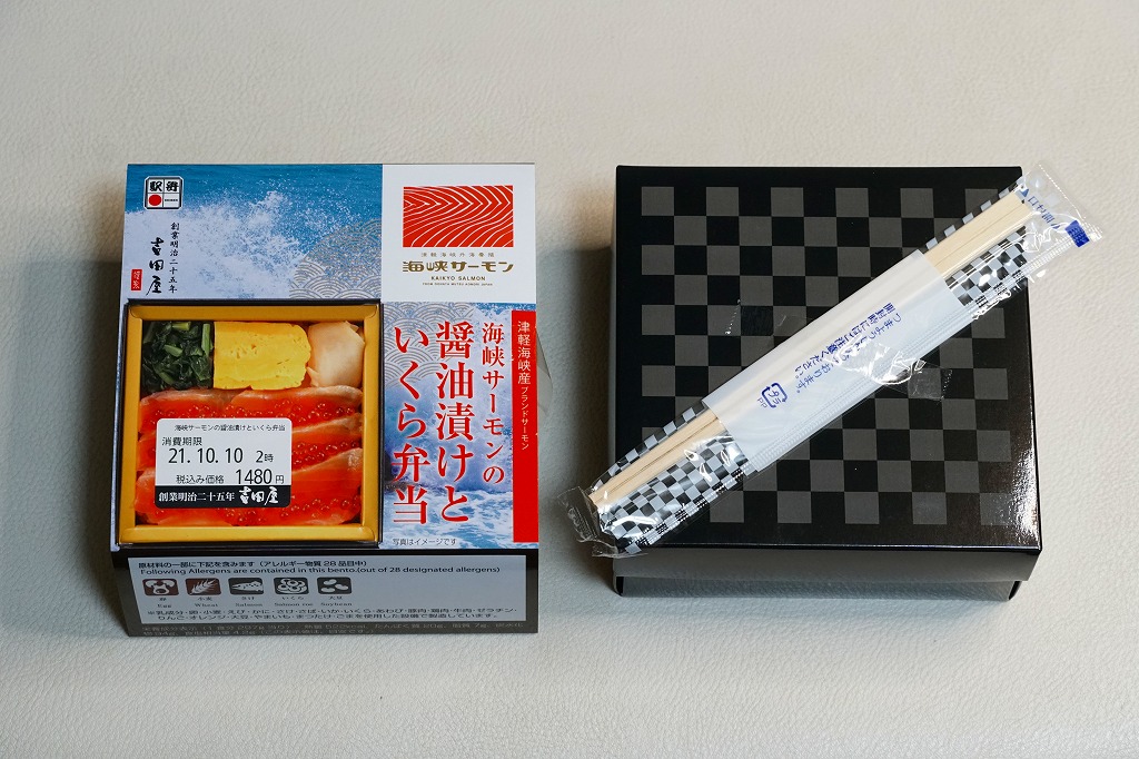 2021(令和3)年8月の発売か。10月のJR東日本の駅弁キャンペーン「駅弁味の陣2021」にエントリー。正方形の紙箱に酢飯を詰め、海峡サーモンの白醤油漬を並べ、イクラを置き、玉子焼、わさび菜、ガリを添える。小柄なのに高額な商品であっても、海峡サーモンの柔らかさと、脂と香りの絶妙さに、スリーブの見本写真に違わない具の美しさで、美味を味わえる。これより安くてサーモンが多く入る八戸駅弁「海峡漬ちらし」と売り場で並ぶと不利かも。駅弁に入る海峡サーモンは、この年に突然うまくなったと思う。価格は2021年の購入時で1,480円、2023年時点で1,600円。