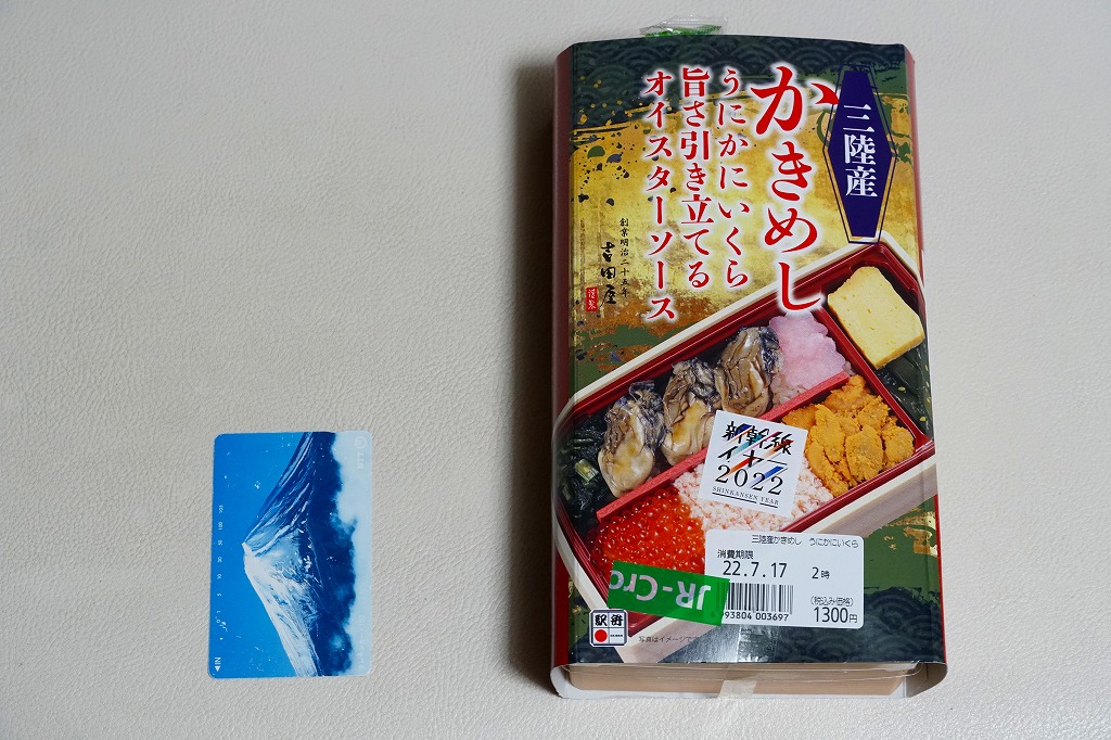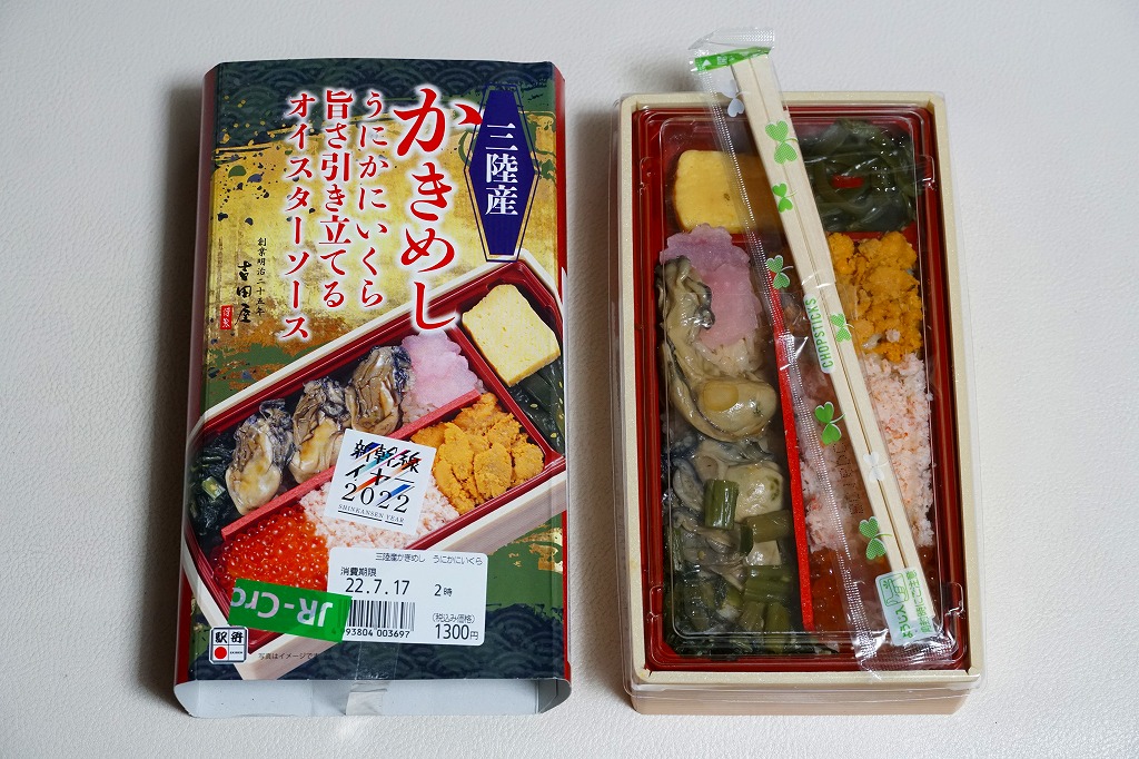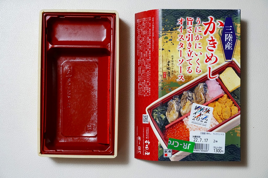 豪華に見せるだけの食材をとにかく集めたように見えて、これらを仕切りを加えてまで整然に並べたので、まるで一口サイズの海鮮丼の詰合せのよう。牡蠣を重ねた名前を持つ主役のかきオイスターソース味は、作り置きの駅弁では乾燥したり収縮しがちなカキに、とろみを付けてみずみずしさを少し与えたように思えた。価格は2022年の購入時で1,300円、2023年時点で1,380円。