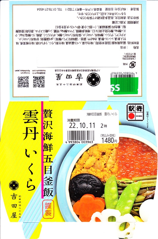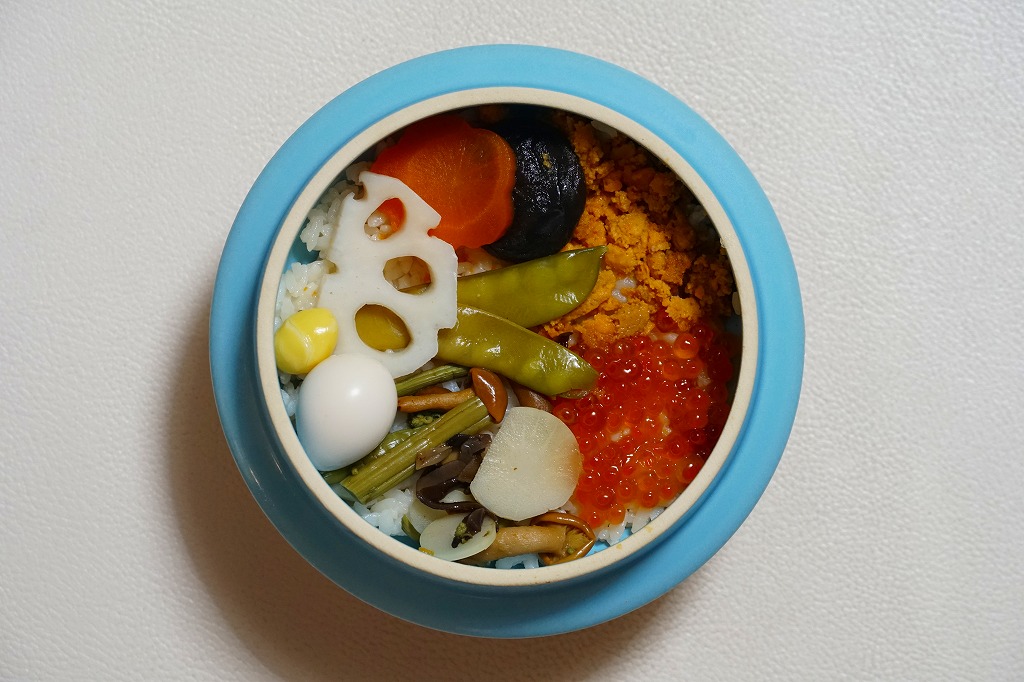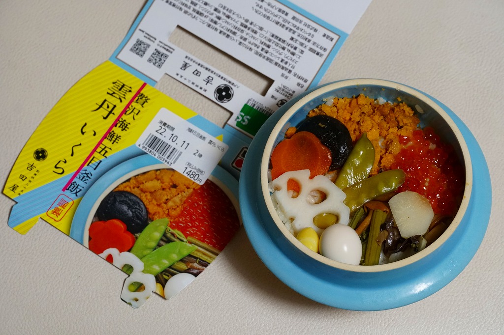 2022(令和4)年10月に盛岡駅、仙台駅、東京駅で発売か。同月からのJR東日本の駅弁キャンペーン「駅弁味の陣2022」にエントリー。水色で陶製の釜飯駅弁向け容器に、プラ製のふたをして、中身の写真を使うスリーブで留める。中身は茶飯を山菜、イクラ、蒸しウニ、うずら卵、しいたけ、にんじん、れんこん、きぬさや、ぎんなんで覆うもの。水色あるいは空色の容器は、駅弁であまり使われないとは思う。商品名どおりの内容で、催事向けの商品に感じる。価格は2022年の購入時で1,480円、2023年時点で1,580円。