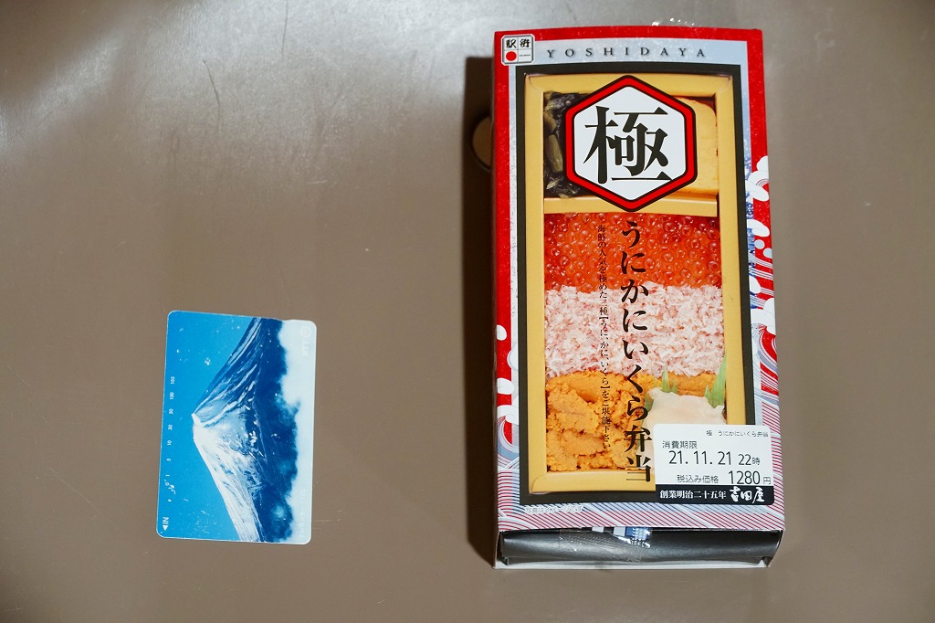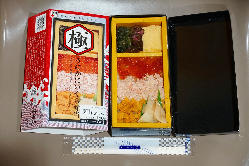 秋冬の駅弁大会シーズンに向けた、2021(令和3)年秋の新商品。紙製の容器に茶飯を詰め、蒸しウニ、ベニズワイガニのほぐし身、イクラの醤油漬で3分の1ずつ順番に覆い、ガリを添え、玉子焼、柴漬け、野沢菜を添付。中身と名前を合わせた、食べて華やかな商品。催事向けに見えるこの内容で、酢飯を使わないのは、ちょっとありがたい。価格は2021年の購入時で1,280円、2023年時点で1,330円。