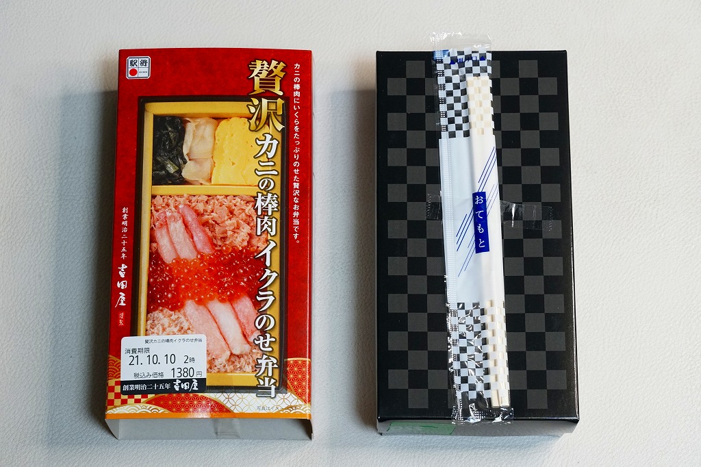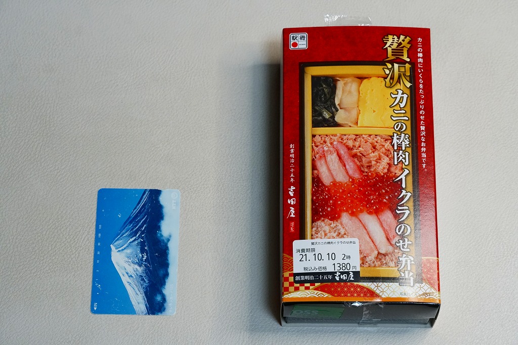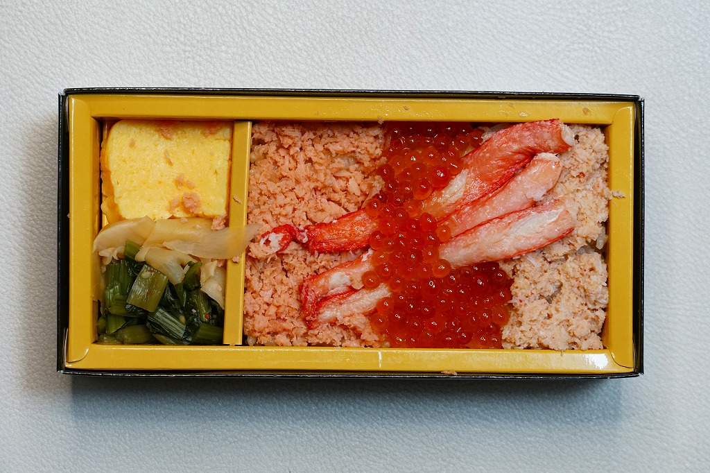 2021(令和3)年9月までに発売か。10月のJR東日本の駅弁キャンペーン「駅弁味の陣2021」にエントリー。長方形の紙箱に茶飯を詰め、鮭フレークとベニズワイカニのほぐし身で覆い、同カニの棒肉を並べてイクラで彩り、玉子焼と野沢菜とガリを添える。新作であっても、内容は過去や他駅にもあるもので、味も見た目どおりにできているので、安心して買って食べてよい駅弁だと思うし、印象に残ったり人気が出たり長く親しまれる駅弁でない気もした。価格は2021年の購入時で1,380円、2023年時点で1,500円。