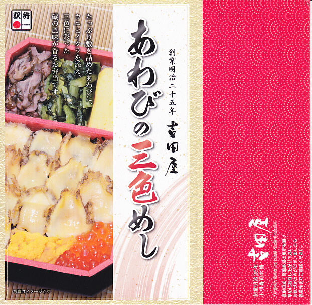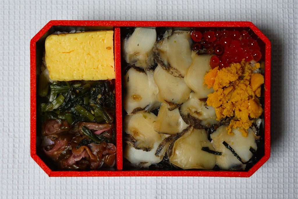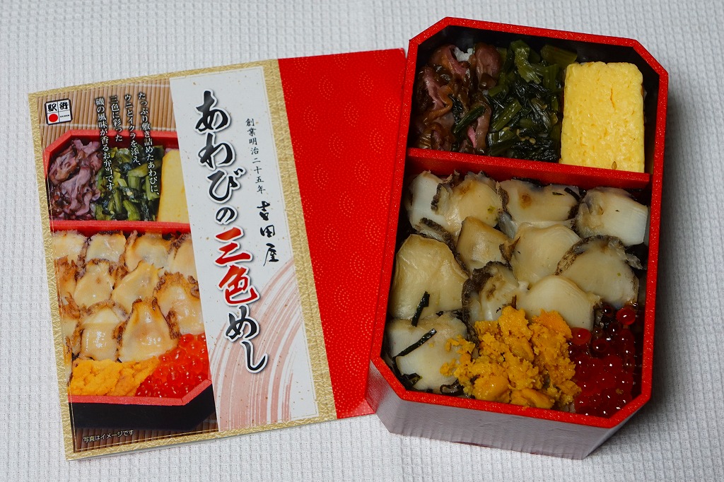 秋冬の駅弁大会シーズンに向けた、2016(平成28)年秋の新商品か。茶飯を多くのアワビに少々のウニとイクラで覆い、玉子焼と野沢菜と柴漬けを添える。付合せの下にも茶飯を詰めた重量級駅弁。2年前の下記「重箱あわびめし」に、かなり似ていると思った。2019年の春頃までの販売か。