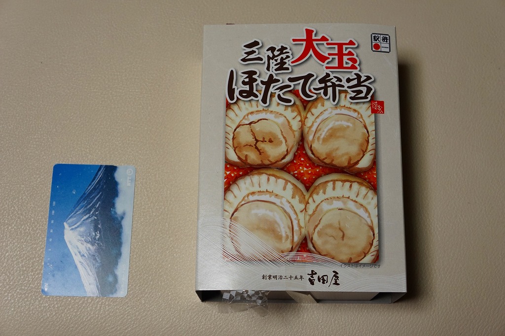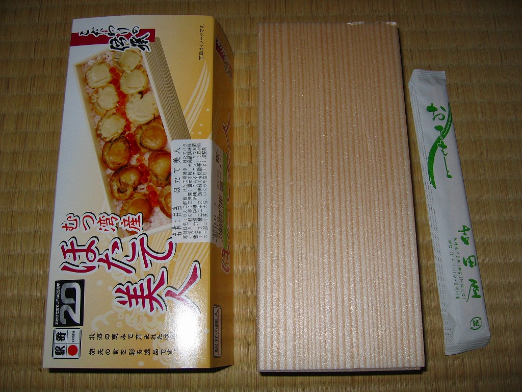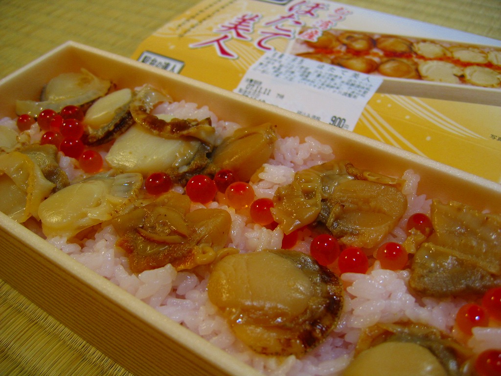 2009(平成21)年の夏までに発売か。表面を木目仕上げとした固いプラスティック製の円形の容器を、駅弁の名前と中身の写真とホタテの貝殻と食べ方を印刷したボール紙の枠にはめる。中身は茶飯の上にホタテの塩焼き2個と貝柱1個、玉子焼の角切りとウニとイクラ、赤かぶ漬、うに佃煮などを散らすもの。中身は写真ほど具だくさんで美しくはなかったけれど、内容に八戸駅弁として目新しいものはないから、味は保証済。2011年までの販売か。