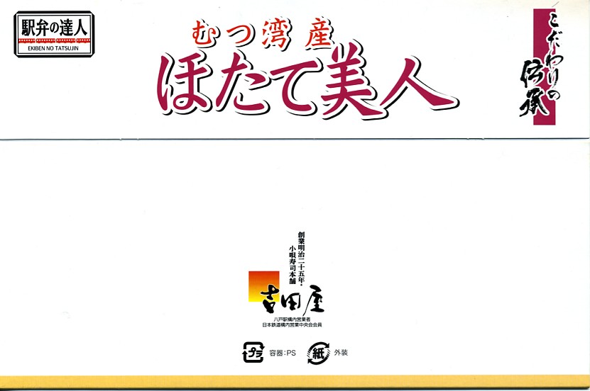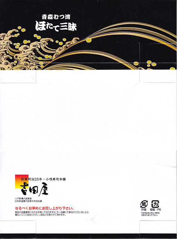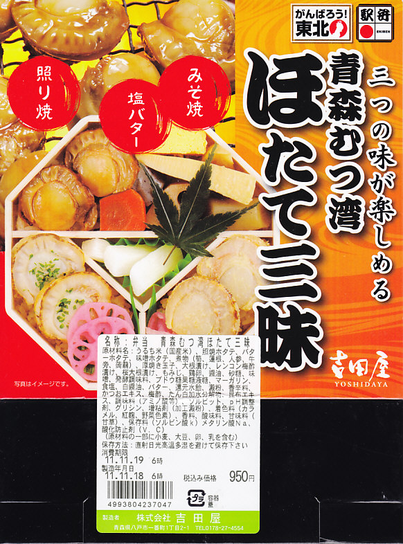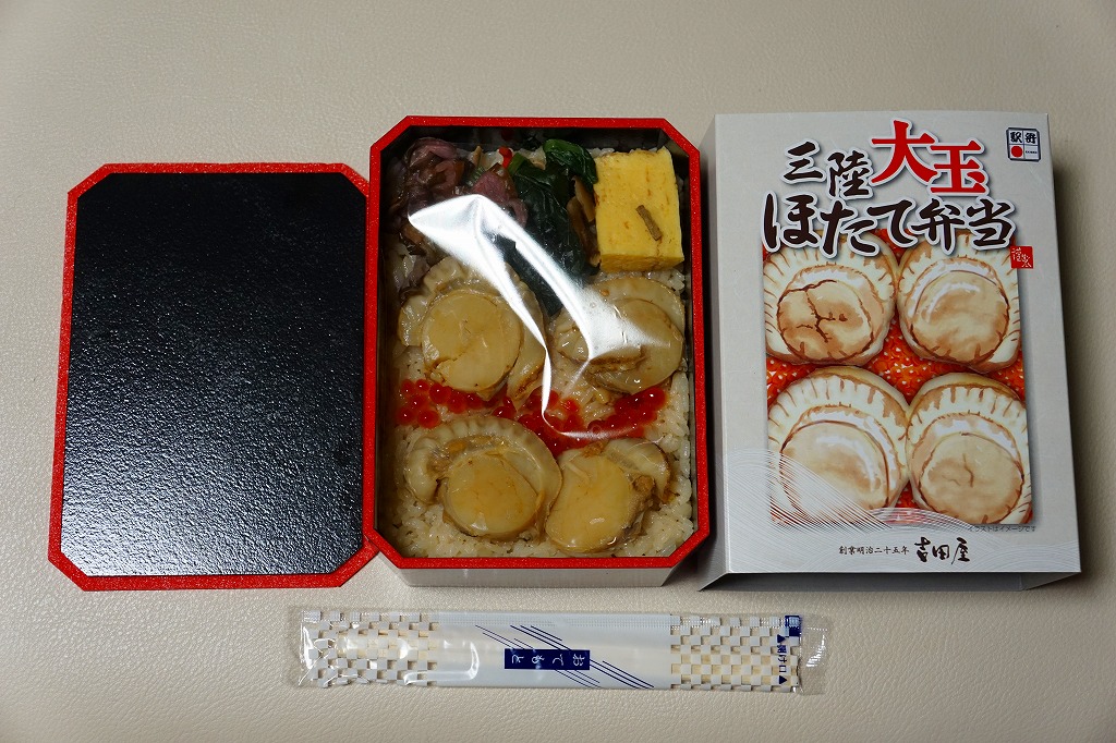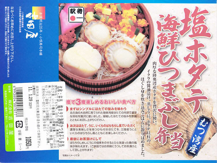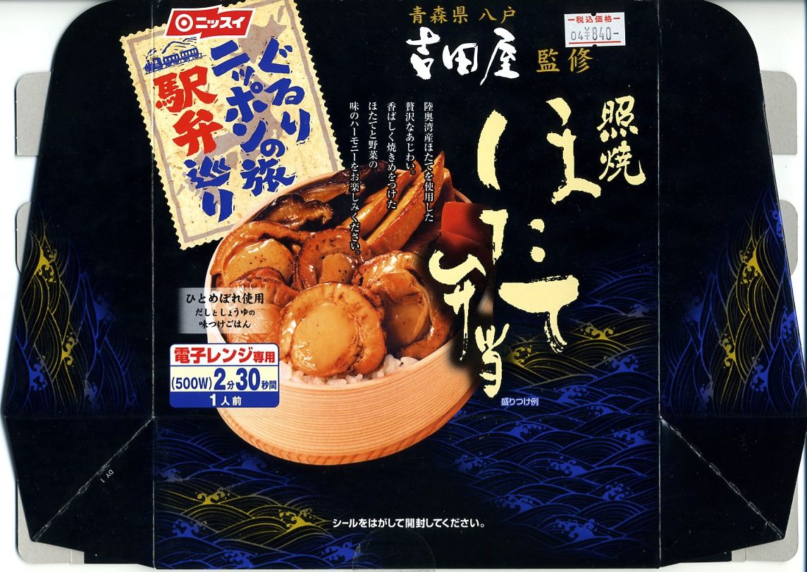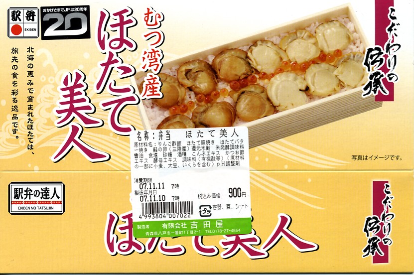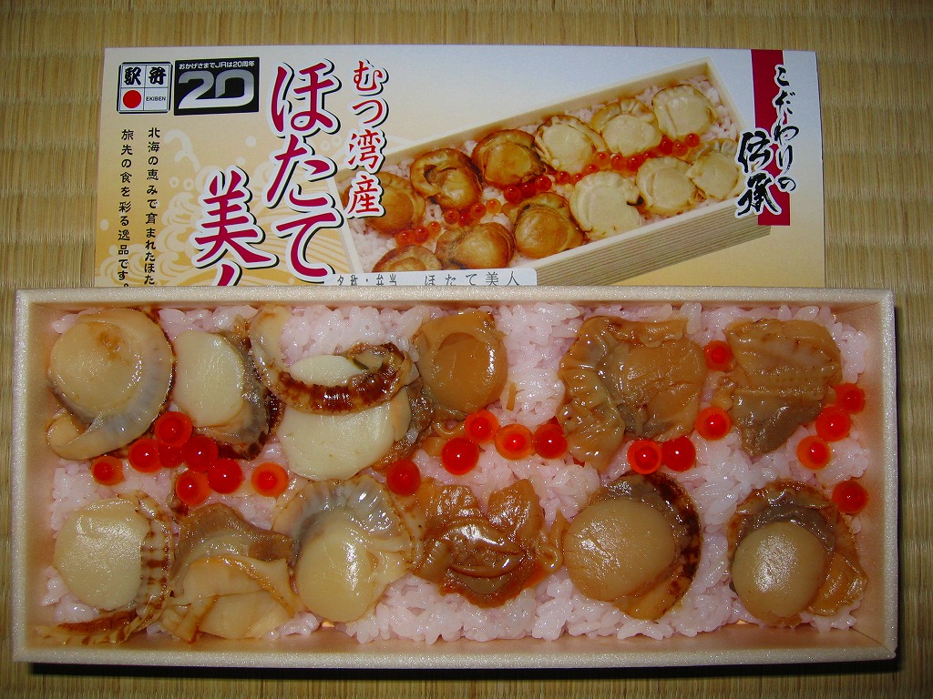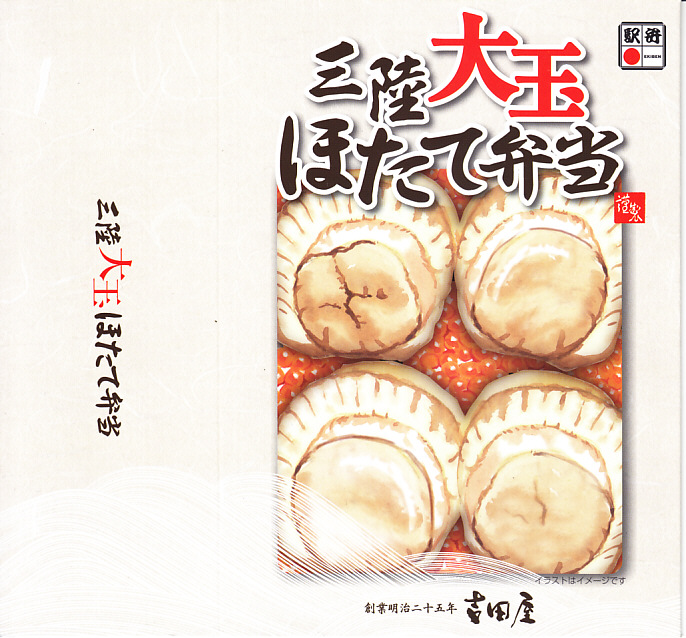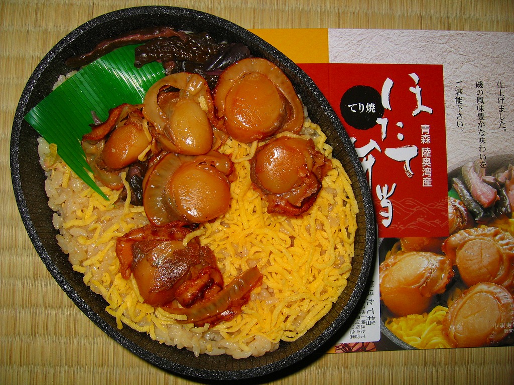 2003(平成15)年の末頃に発売か。黒い楕円形の容器にプラ製の透明なふたをして、中身の美しい写真を載せた紙枠にはめ、割り箸を刺す。中身はその写真ほど美しくはないが、煮汁で炊いた茶飯の上に柔らかくテリの良い中型帆立が6個ほど載るもので、なんとも食べ応えがある帆立丼。八戸は陸奥湾には面していないものの、ここで出会える帆立駅弁に不自然な感じはしない。価格は2006年の購入時で850円、2008年7月1日から880円。2009年頃までの販売か。