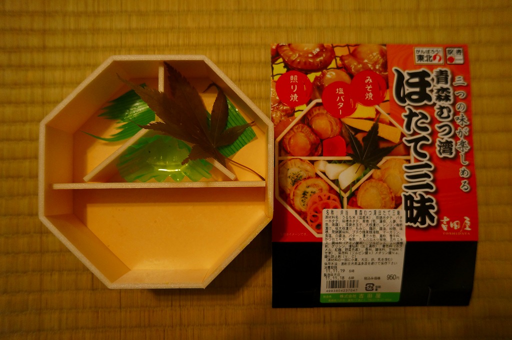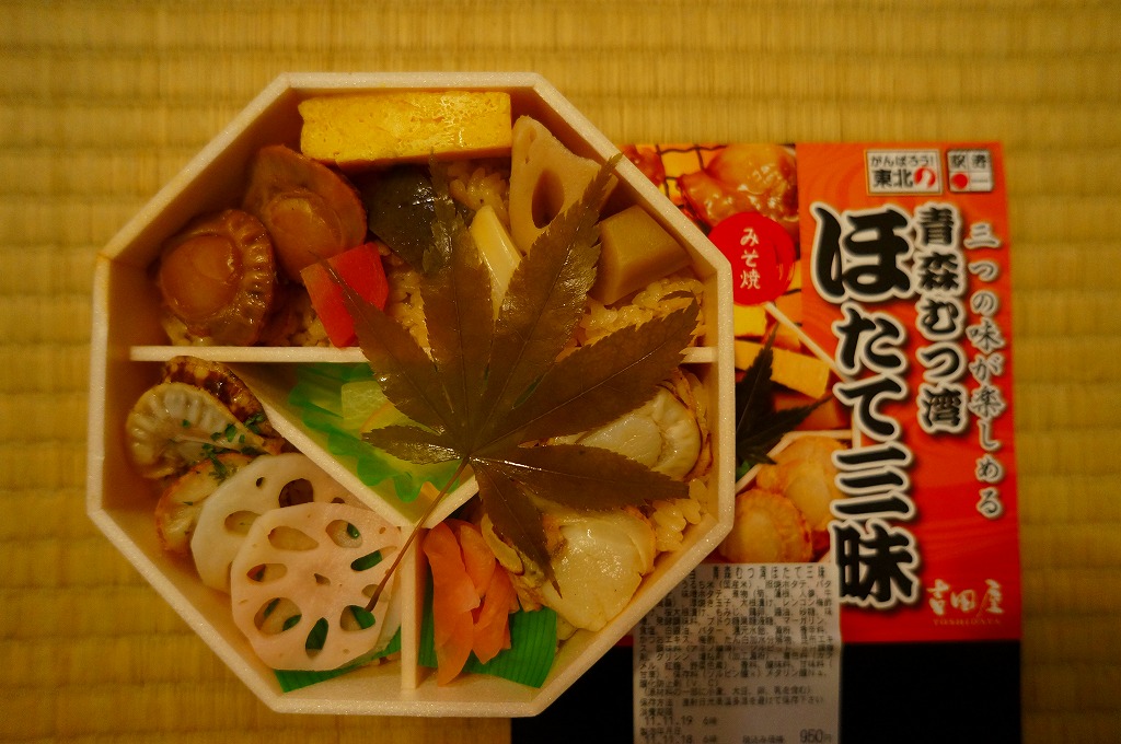 2011(平成23)年の9月までに発売か。正八角形の容器を、中身とそのイメージの写真を美しく印刷したボール紙の枠にはめる。中身は茶飯の上を小さなホタテの味噌焼にニンジンやゴボウなどの煮物と玉子焼で覆う区画と、茶飯の上を小さなホタテのバター焼とレンコン梅酢漬で覆う区画と、茶飯を小さなホタテの照り焼と大根桜漬で覆う区画と、大根漬の区画で構成され、本物のもみじの葉を添えるもの。見ればホタテは小さいものが各2個ずつしかはいていないが、他のおかずがしょぼい(失礼)こともあり、ホタテづくしという印象は強く感じた。御飯だらけの駅弁でもある。1年間ほどの販売か。