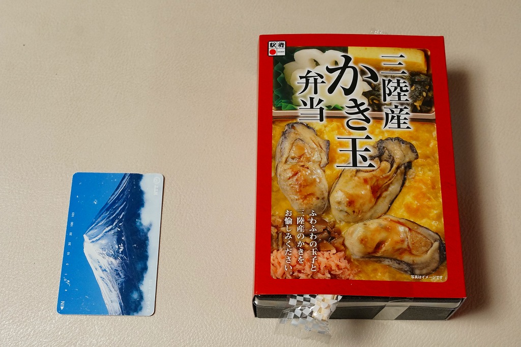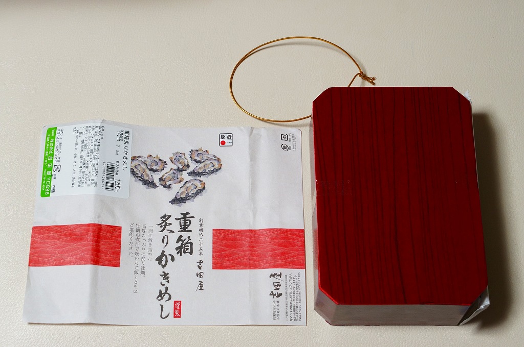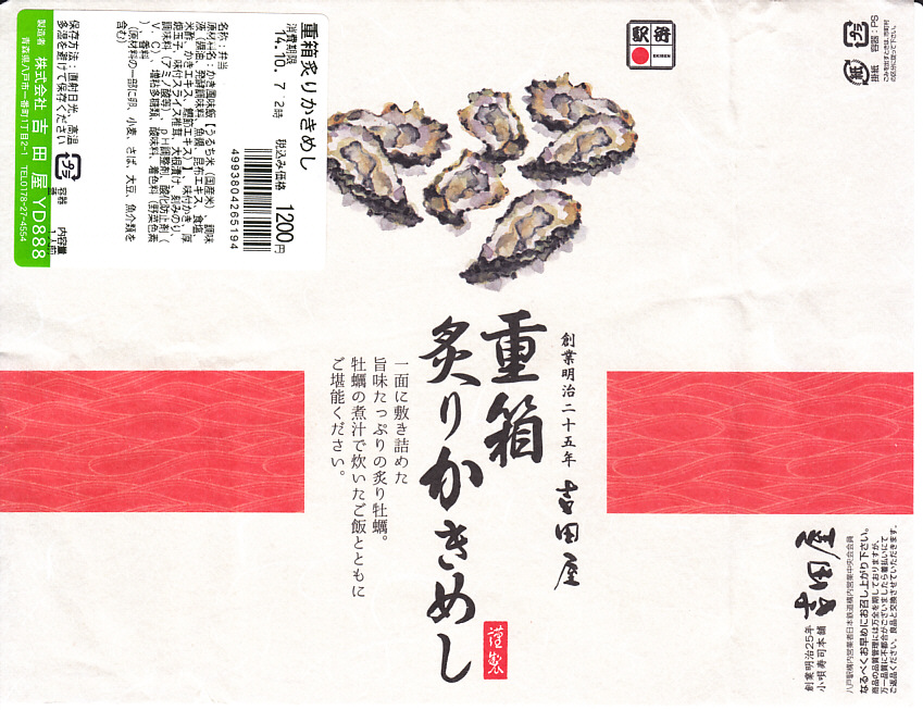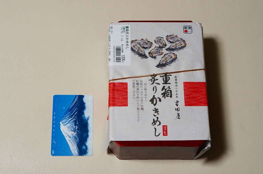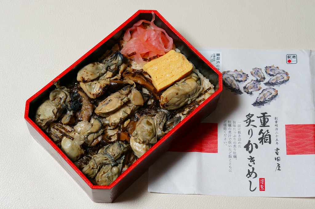 「重箱」を名乗るも重箱を使わず、上げ底の容器にカキ風味御飯を薄く敷き、海苔とシイタケを刻んで覆い、カキ7個を列べ、玉子焼と大根漬を添える。常温でクリーミーなカキを食べる駅弁としては、他駅に遜色のないものだと思った。2016(平成28)年度までの販売か。