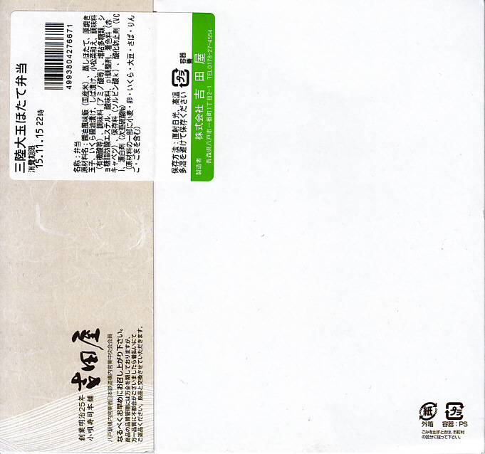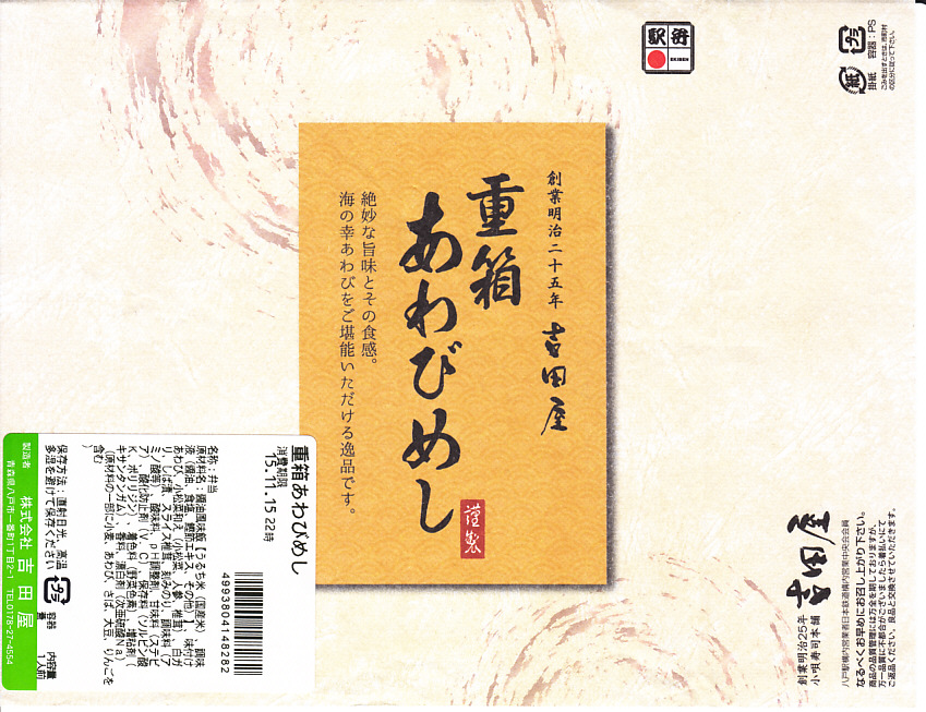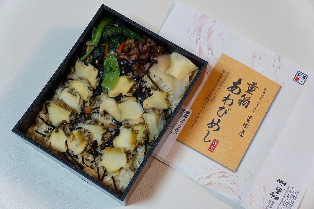 「重箱」を名乗るも重箱を使わず、上げ底容器に身を薄く敷く一階建。茶飯に刻み海苔をまぶし、細かいアワビのスライスをちりばめ、小松菜とガリと柴漬けを添える。メインのアワビは、かまぼこのような味と柔らかさ。こういう淡い味と同じ空間に、柴漬けという刺激物を詰めるなど、おかしい、もったいない、みっともないと思った。2016(平成28)年度までの販売か。