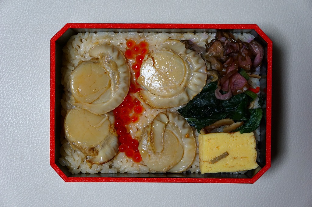 2015(平成27)年7月までに発売か。茶飯の上に、大粒に照るホタテを4個きれいに並べ、イクラ、玉子焼、小松菜、柴漬けで残りを埋めるホタテ丼。ボール紙枠の絵柄もシンプルに、商品名とホタテ4個とイクラ。食べれば大味に感じるが、見た目や写真では豪華。年内で終売か。