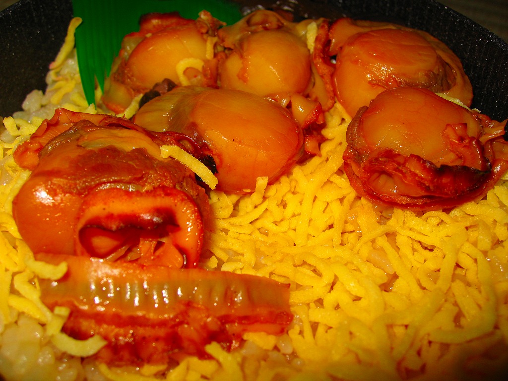 中身は味付飯の上に、暖めたレトルトに入っていたホタテ、タケノコ、シイタケ、ニンジン。八戸駅弁の「てり焼ほたて弁当」とは中身が異なり、八戸駅の駅弁と1対1に対応する商品はないと思うが、ホタテ駅弁の雰囲気は出ていると思う。ただ、味は少々酸っぱい感じ。