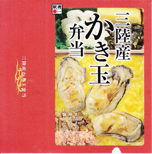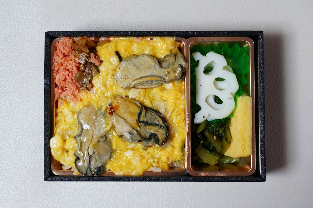 秋冬の駅弁大会シーズンに向けた、2018(平成30)年秋の新商品か。白飯を液卵で覆い、カキ煮3個を置き、鮭と椎茸のフレークを添え、少々の付合せ。カキも分量も控えめで、気楽に食べられる軽食。カキと卵という食材と調理で消費期限を丸一日持たせられる技術に感心する。秋冬の駅弁大会シーズの終わりをもって、半年間ほどで終売か。
