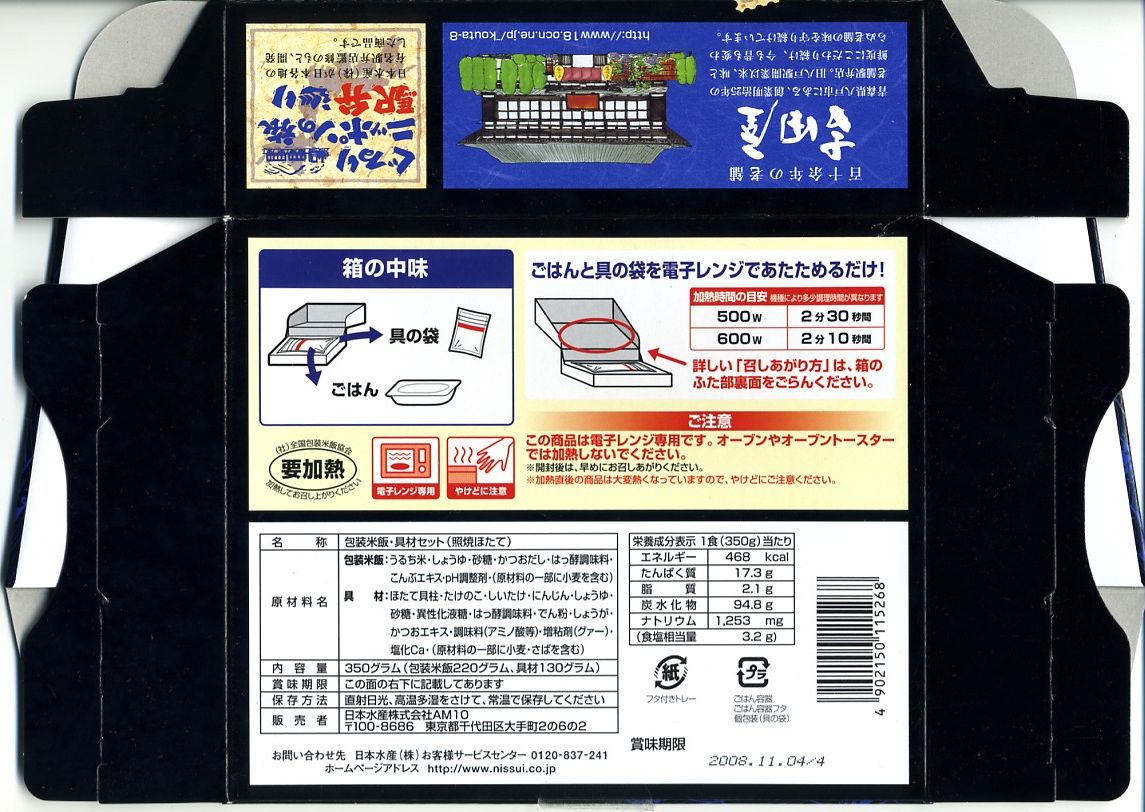 側面のロゴマークに加えて容器の激しい上げ底にも催事臭を感じるが、御飯、帆立、風味のやわらかさは駅弁の域を超えており、催事で名を売ったうえで現地にて定番になるのではないかと思うし、実際にこの2007−2008年の駅弁大会シーズンの駅弁催事では人気を集めた。京王の駅弁大会から会期中に追放された事実は、ちょっと気になる。半年間ほどの販売か。