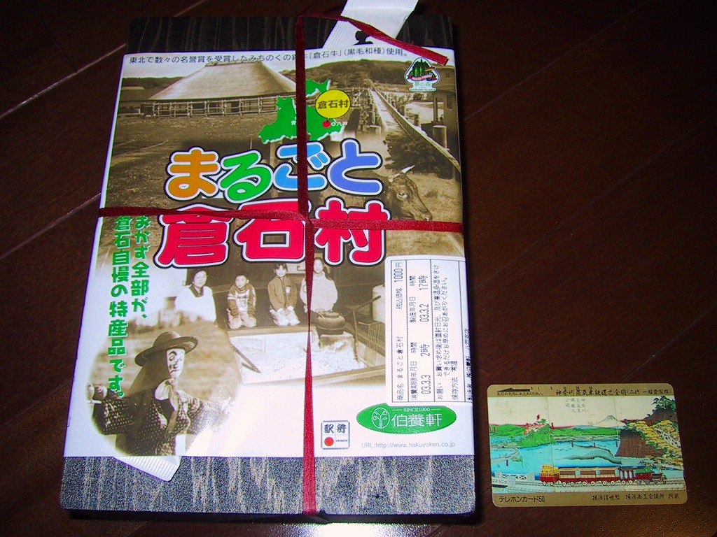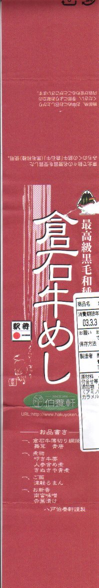 東北で数々の名誉賞を受賞しているという、青森県三戸郡倉石村特産の「倉石牛」は、冷たいのに柔らかさとサクッとした食感に牛肉らしい風味が備わるなど、中身は申し分なし。あとは原材料や消費期限を印字したシールをなんとかすれば、絵にもなる駅弁になれるはず。なお、倉石村は2004年7月1日に五戸町と合併し消滅した。