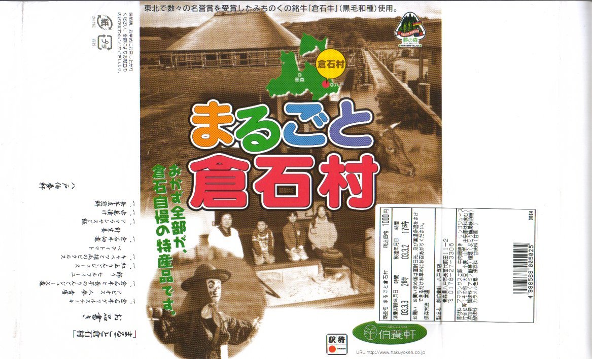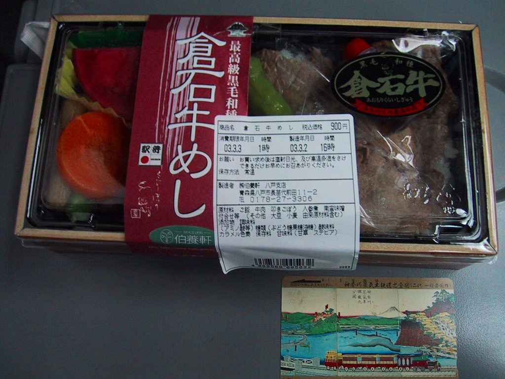 東北新幹線の八戸延伸に合わせて、2002(平成14)年12月1日に発売。内側が青く外側が黒い木目調の独特な容器に、郷愁を誘うセピア色の写真を載せた掛紙をかけて紫色の紙ひもでしばる。中身は牛肉が少ない牛肉弁当といえ、白御飯に倉石牛の網焼やそぼろや佃煮などが入り、デザートに見えるカップは濃縮還元をしていないりんごジュース。味は良いのに価格の割に隙間が多く見た目で損をしているが、御飯を除きすべてが倉石村産の食材を使用したというから、村の豊かさを感じさせる。