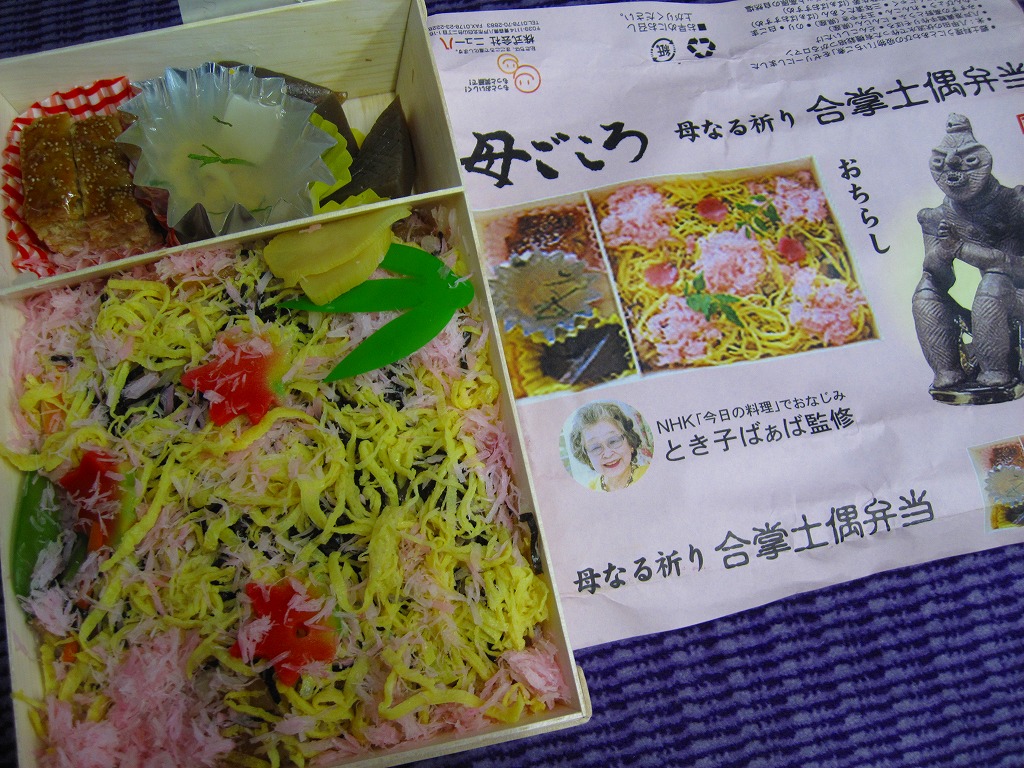 NHK「今日の料理」の「とき子ばぁば」こと鈴木登紀子氏が監修したとある。調製元にとって究極のちらしずしだそうな。淡いピンク色のちらしずしの調味がやわらかく、添付のゼリーは甘くなく、ちょっとおすすめしたくなる雰囲気の良い駅弁。