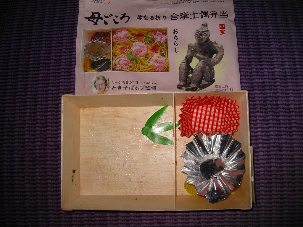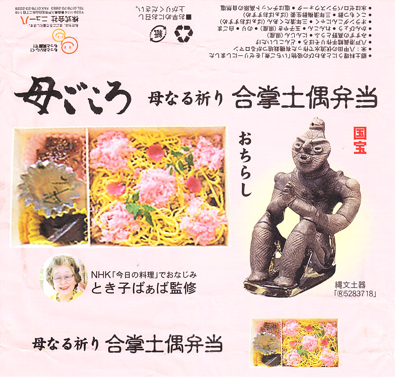 合掌土偶とは、1989年7月に青森県八戸市の風張1遺跡で縄文時代後期の竪穴住居跡の片隅から出土し、2009年3月には国宝に指定された土偶で、掛紙写真のとおり座って手を合わせていることからこの名が付いた。商標を八戸市が保有しており、この弁当も使用許可を取って文字と図形を掲載している。