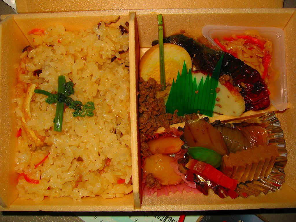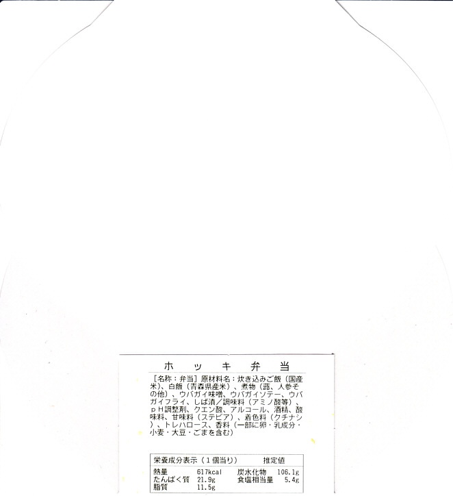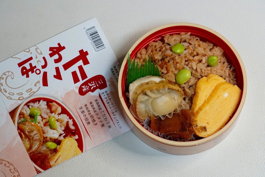 2010(平成22)年12月の東北新幹線全線開業とともに、八戸駅で発売か。この内容の弁当はその頃には、調製元の本業である三沢市内の小僧寿しチェーンで売られていたらしい。楕円形の容器は4つに区画され、ホッキのソテーを載せた炊き込み御飯、ホッキみそ丼、ホッキのフライと柴漬け、フキとニンジンの煮物にがんもどき。常温で作り置く駅弁も回転寿司などでも、どうしても固かったり臭みが出がちなホッキ貝にあって、これは不思議と普通に食べられて、味噌和えに揚げ物と個性的な姿もいただける。知名度はないけれど、優れた駅弁。価格は2020年時点で1,300円、2025年時点で1,490円。