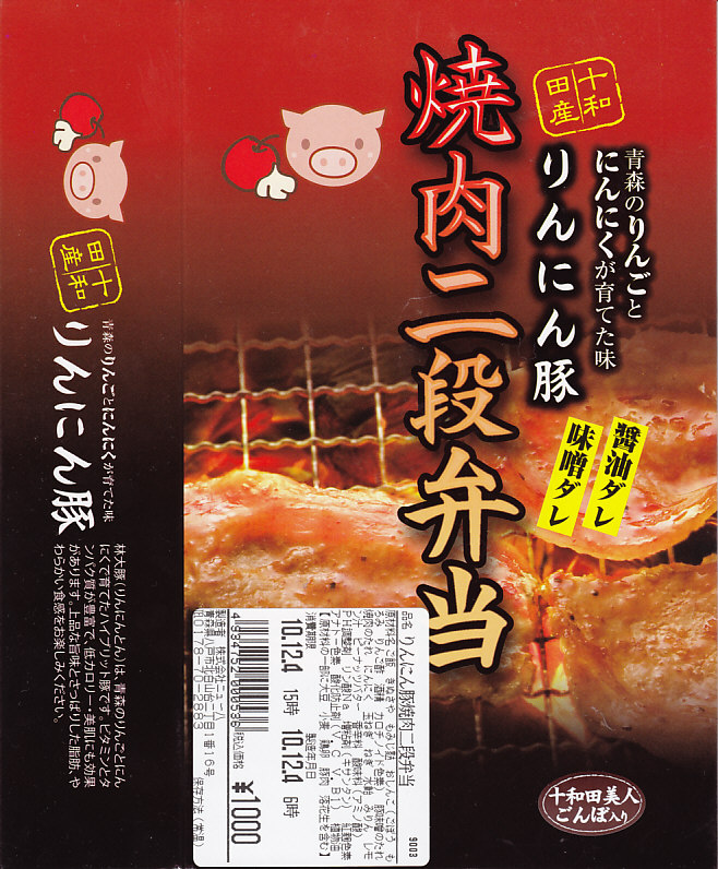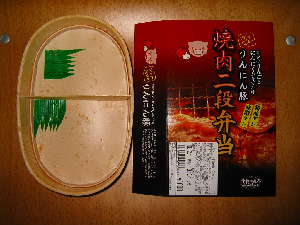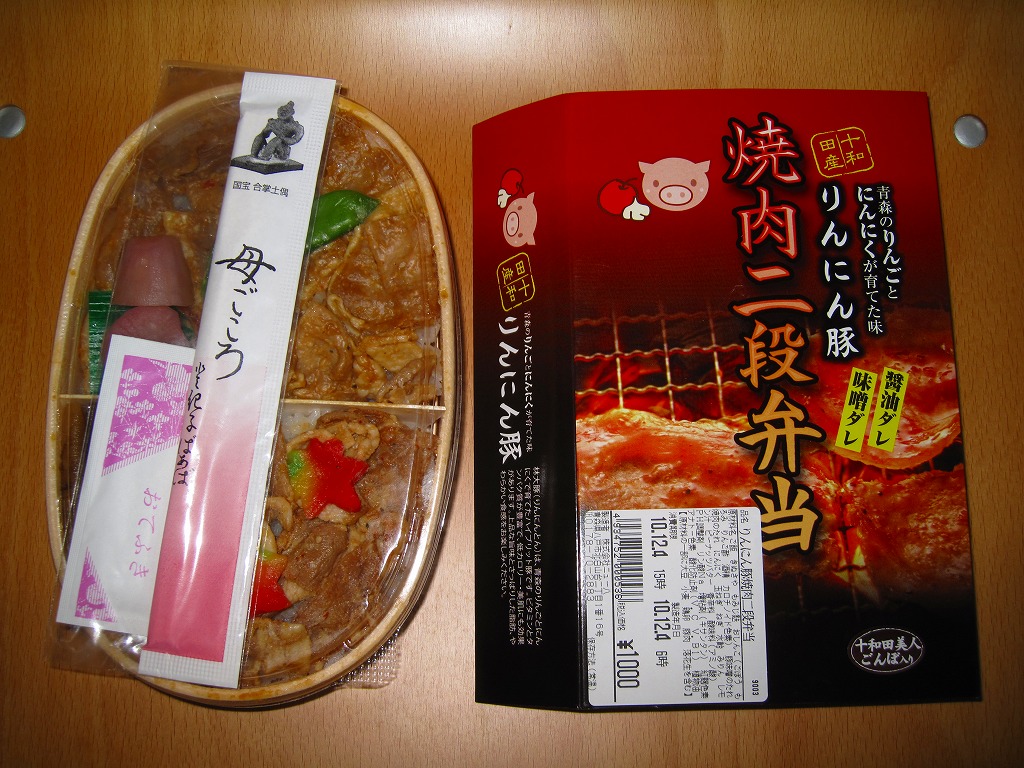中身は半分が白御飯の上に豚肉味噌焼を、半分が白御飯の上に豚肉醤油焼を、飯の中と上に重ねる豚焼肉弁当。これにきぬさや、もみじ麩、ごぼうを添える。リンゴの繊維とニンニクを混ぜた飼料で育ったという「林大豚(りんにんとん)」の豚肉は見た目に白い脂が少々浮いているが、臭みもなく飽きない感じ。しかし同時デビューの「せんべい汁弁当」のインパクトが強烈であるため、こちらは話題になっていない。