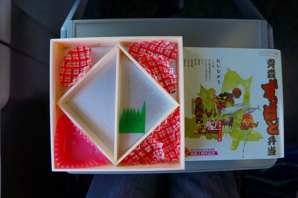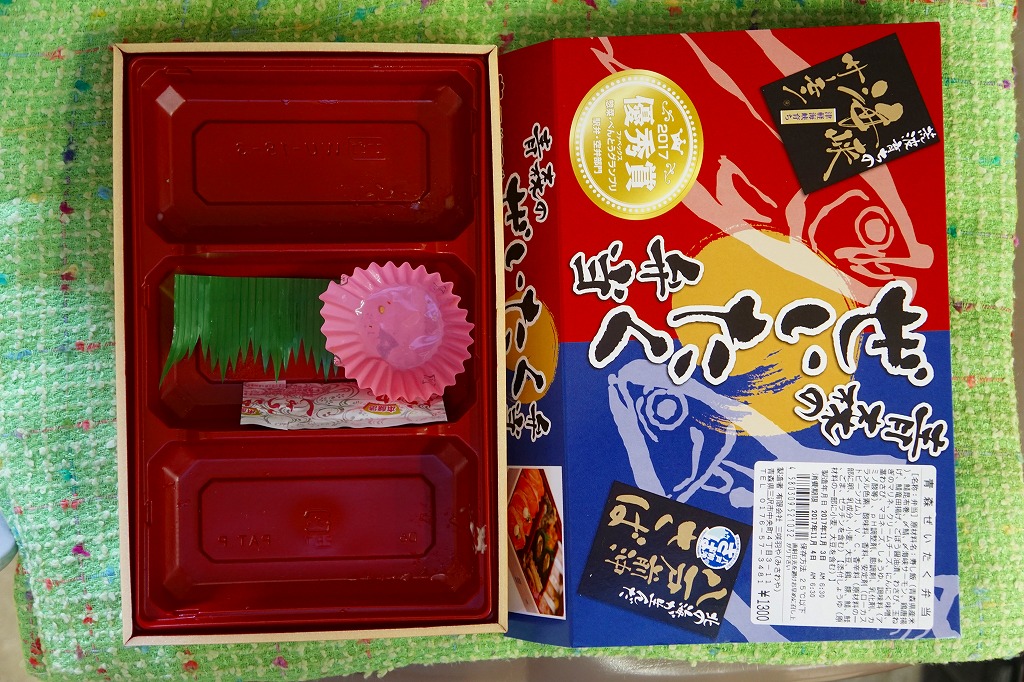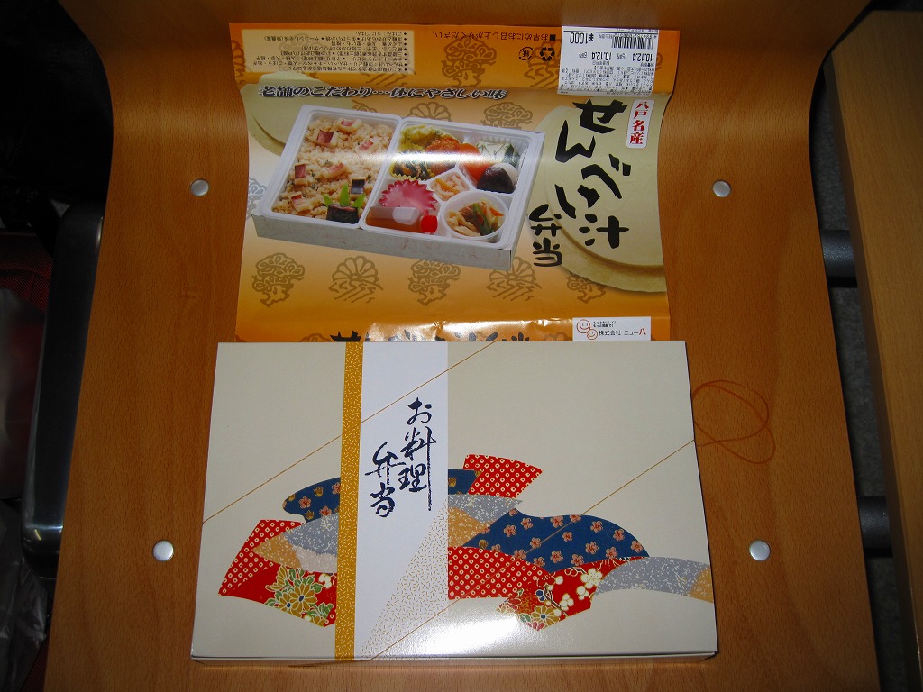 掛紙には力強く「八戸駅弁」の文字が入る。八戸市内の仕出し料理屋が新幹線延伸を機に駅構内での販売に進出したものだが、新聞報道には「念願の」という枕詞が付いており、駅弁への進出が本当に嬉しかったのだろう。駅弁は明らかに衰退へと向かっているので、このような業者さんには感謝状を送らなければならないのではと思う。