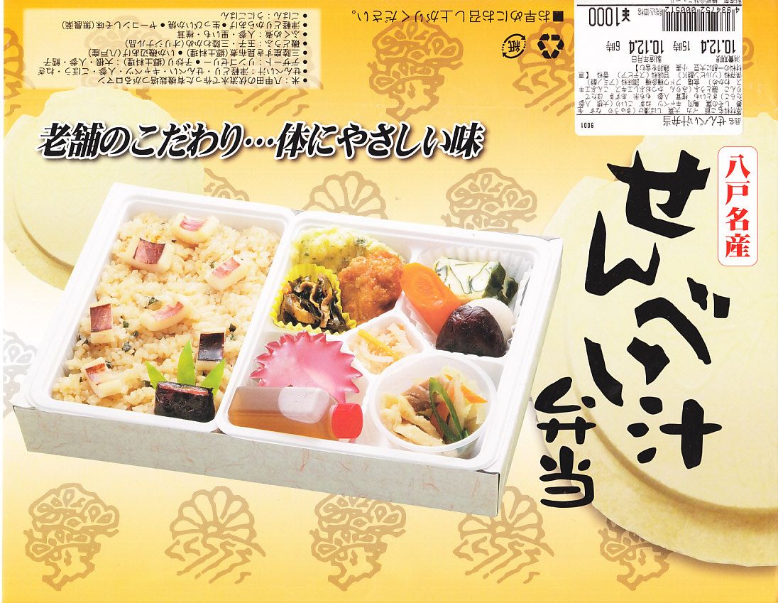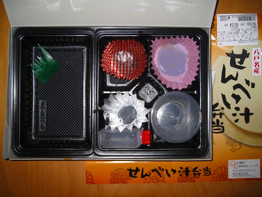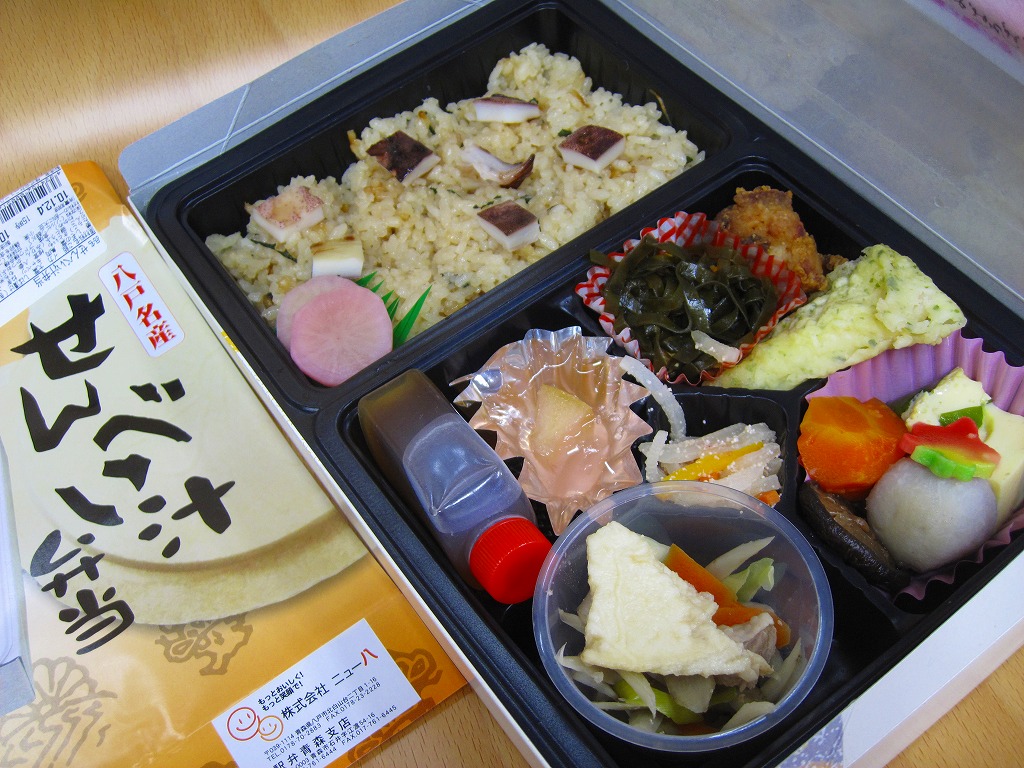 中身はイカをまぶしたウニ飯に、イカ磯部揚、鶏唐揚、昆布煮、サトイモやニンジンなどの煮物、ダイコンとニンジンとたらこの和え物、リンゴゼリーと、メインの「せんべい汁」。プラ製カップにせんべい、キャベツ、ニンジン、ごぼう、ネギが入っており、これにボトルのだし汁をかけて食べる。個性はそこだけで、他はキワモノでもゲテモノでもない、雰囲気と風味の良いお弁当。