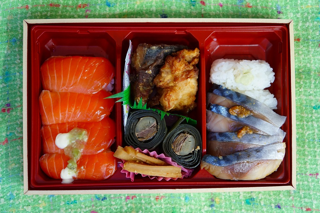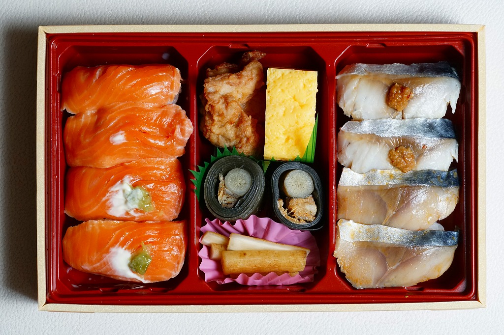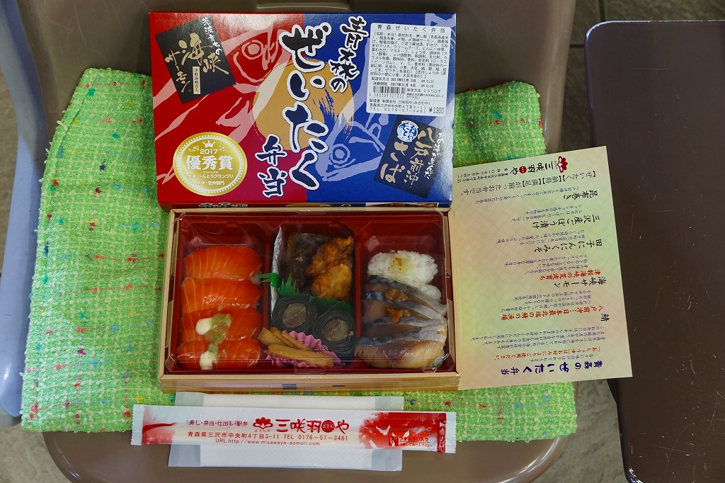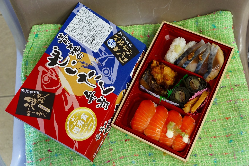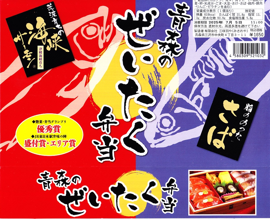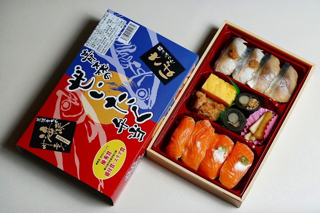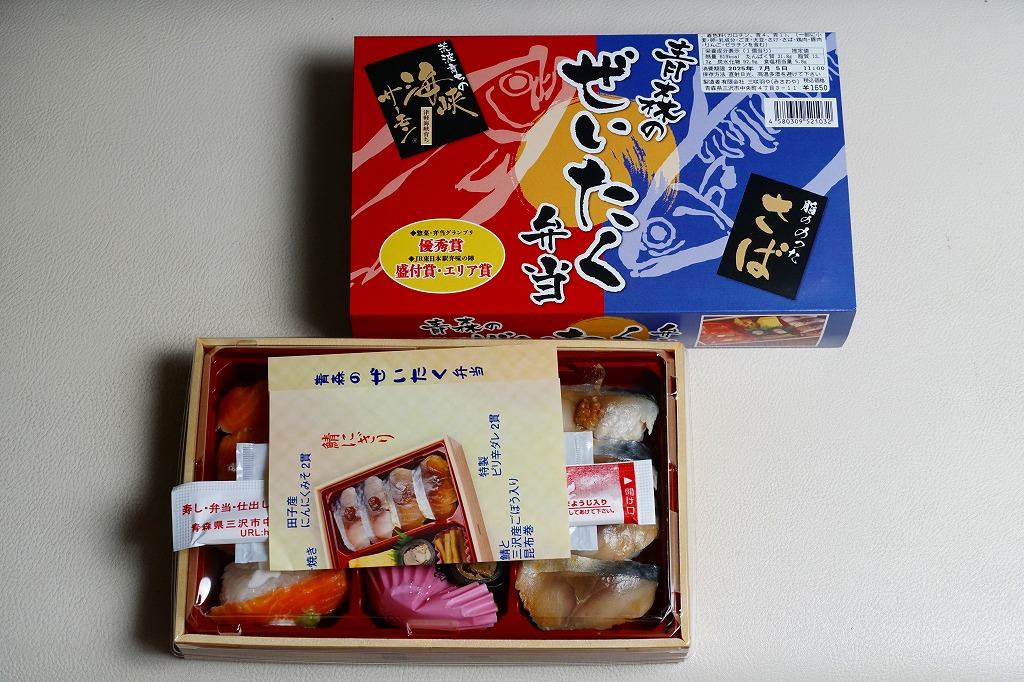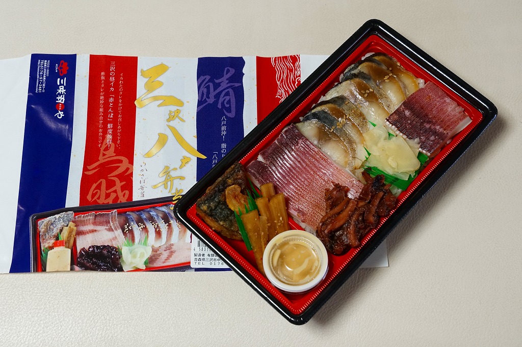 長方形の容器に酢飯を詰め、薄く薄くスライスしたイカ一夜干しやサバで覆い、イカゲソやサバ竜田揚や生姜やごぼうなどを付け合わせる。三沢沖地域ブランドの昼イカ「赤とんぼ」というイカが新鮮で、銀鯖(八戸前沖鯖)というサバにも脂が乗り、控えめな見栄えに違い味は極上。食べて食べ比べた人だけで票を数えれば、きっと駅弁味の陣の駅弁大将軍になれる。無名のままにしておくには惜しい、とてもうまい駅弁。価格は2020年時点で1,250円、2025年時点で1,380円。