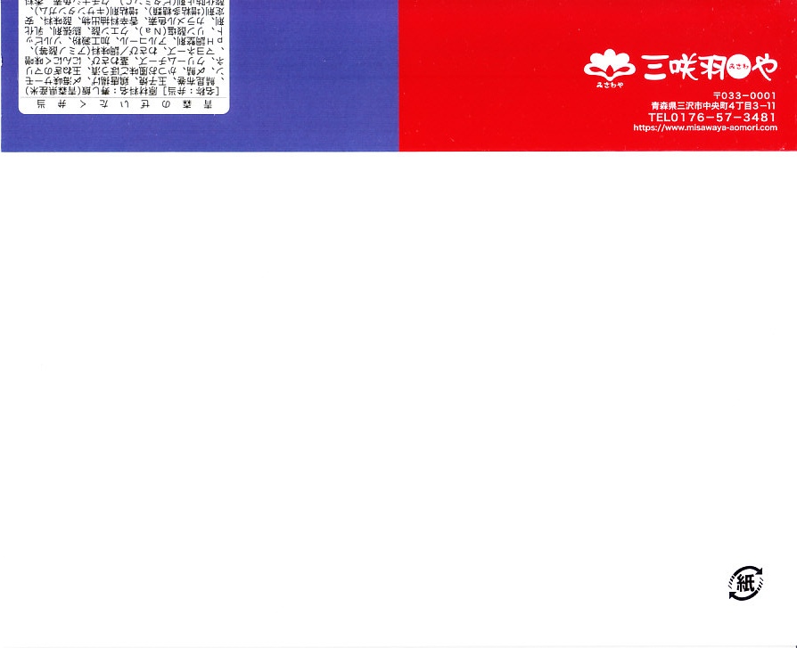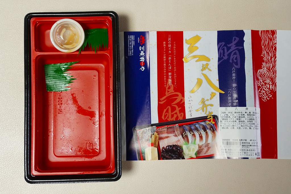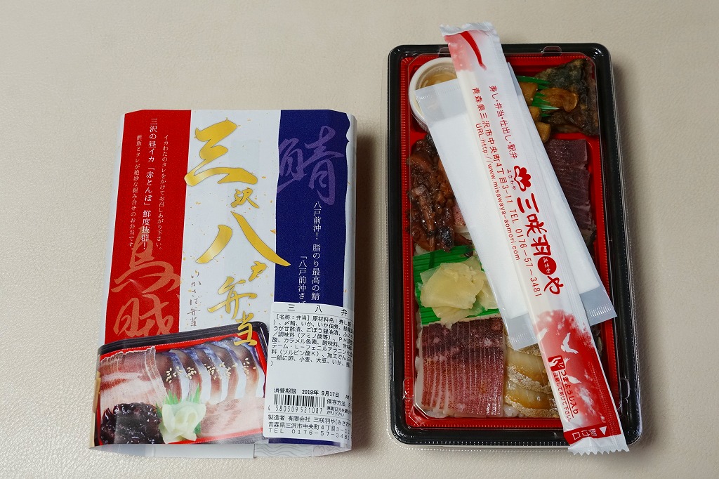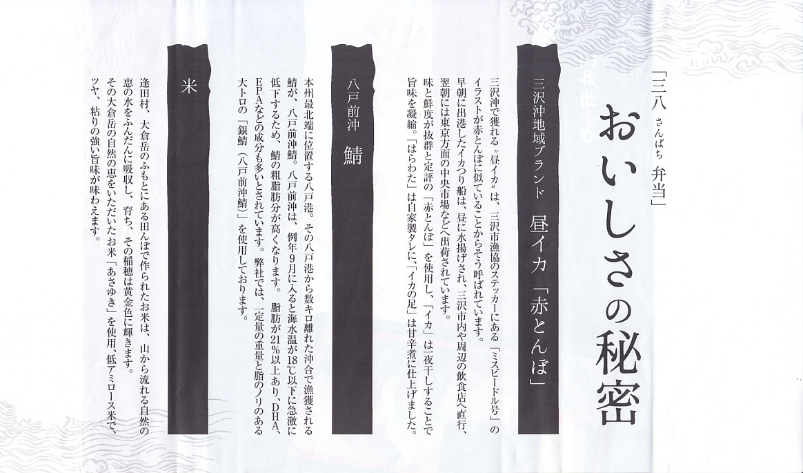 2016(平成28)年に盛岡駅や八戸駅や新青森駅で発売か。駅弁の名前は「三沢八戸弁当」とも「三八弁当」とも「いかさば弁当」ともされるが、掛紙裏面と食品表示には「三八弁当」とあり、おそらく「さんぱちべんとう」と読む。ここでは掛紙で最も大きな文字での表記に従った。赤青白でトリコロールの掛紙には、中身の写真と宣伝文も描かれる。