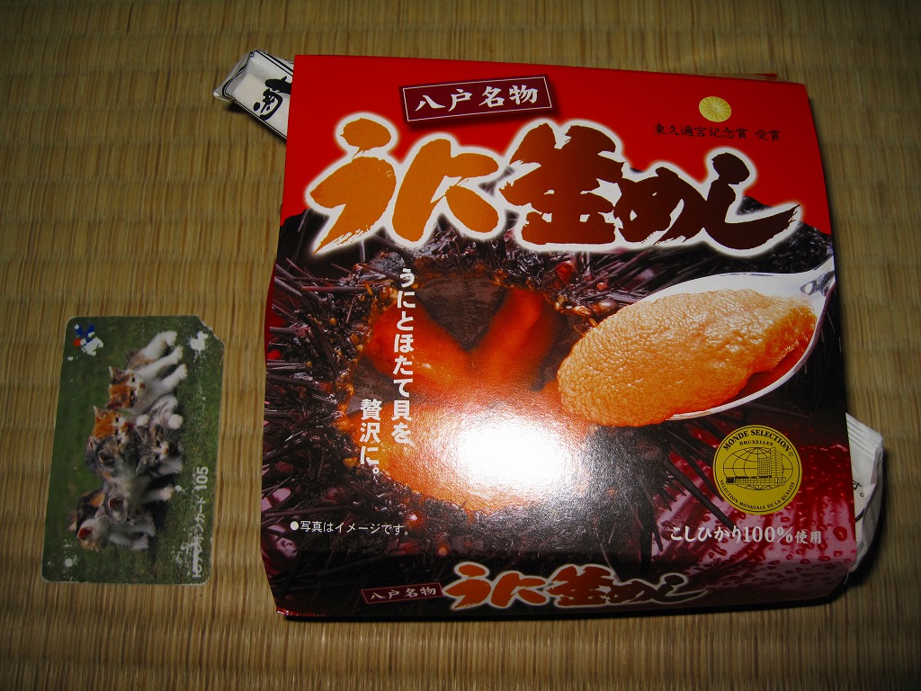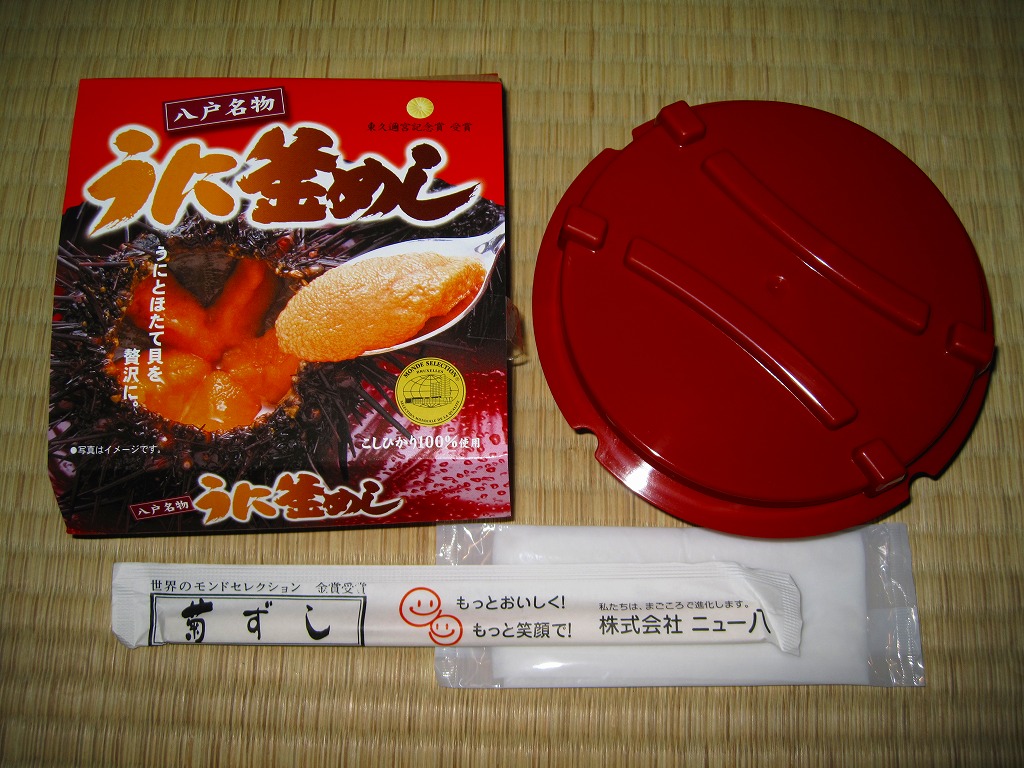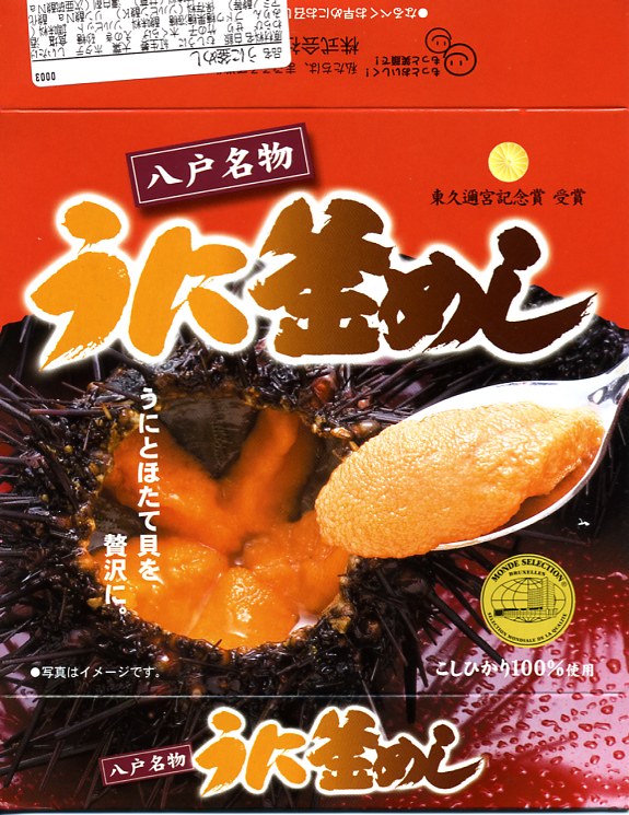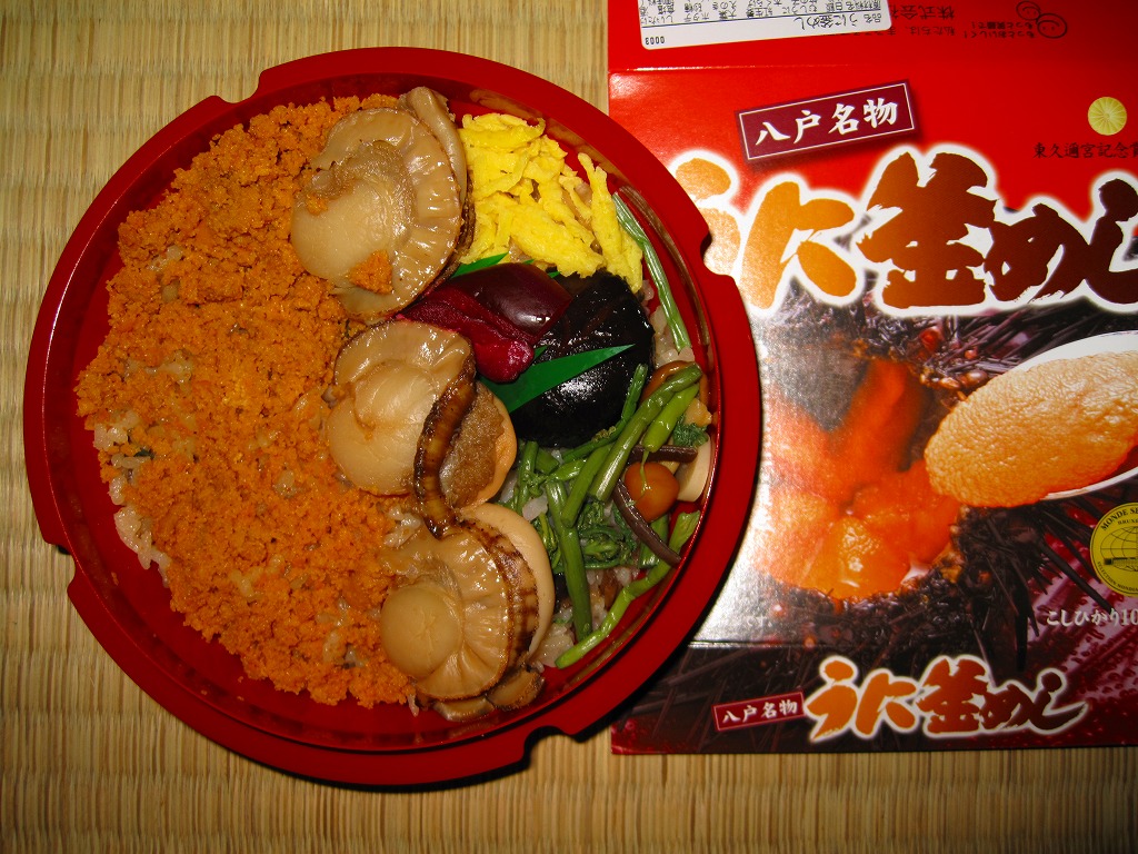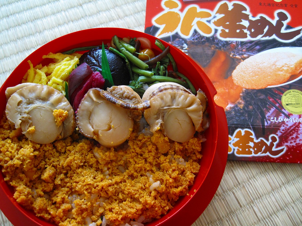 2006(平成18)年までには発売。平たく赤いプラ製の釜飯風容器を使用、ウニの写真を大きく掲載したボール紙の枠にはめる。中身は山菜と大葉の混ぜ御飯に、蒸しウニと煮帆立3個と山菜などを載せるもの。この価格なのにウニにボリューム感があり、ウニ以外の御飯もおかずもおいしいし、東久邇宮記念賞だとかモンドセレクションだとかの大量発行な賞の宣伝をしなくても、十分に良い駅弁だと思う。