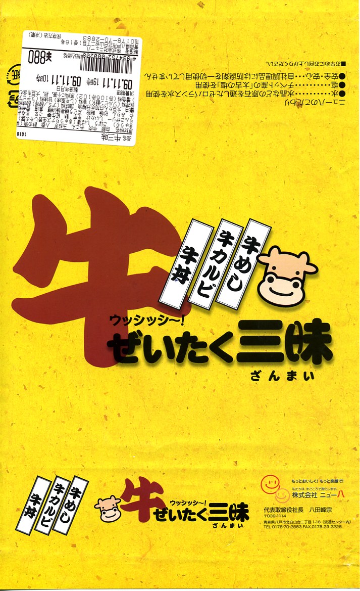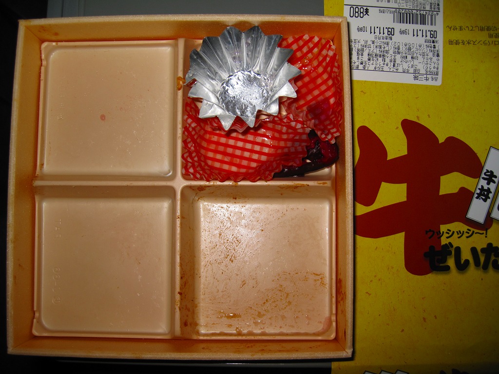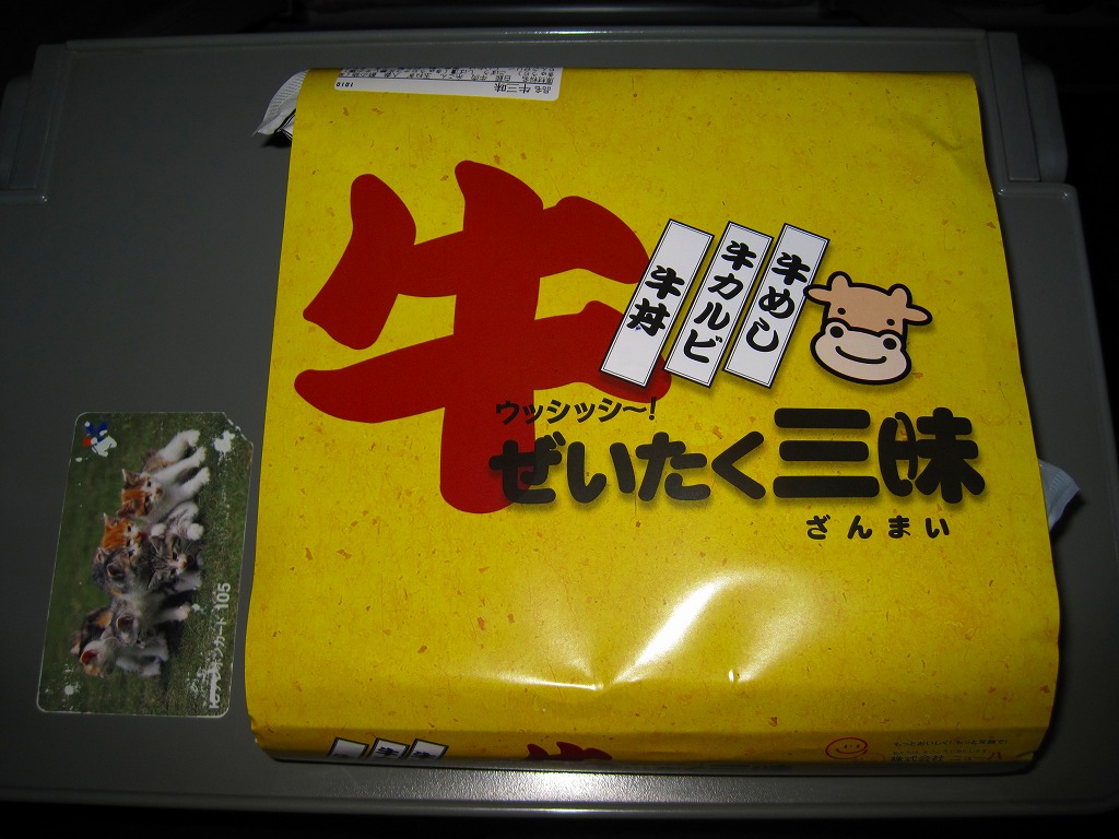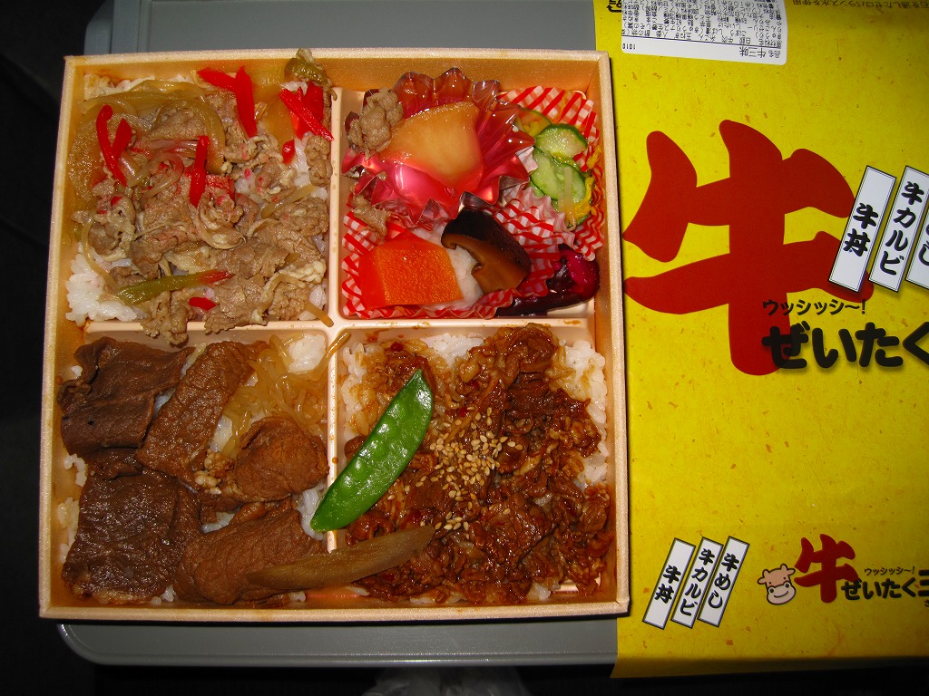 2007(平成19)年に発売か。正方形の華奢な容器に透明なふたをして、おしぼりと割りばしを置いて輪ゴムで留め、商品名を書いた黄色い掛紙を巻いて、セロテープで留める。田の字の中身はそれぞれ、牛丼、牛カルビ丼、牛めし、煮物やキュウリと菊の酢の物やリンゴゼリーなどのおかず。