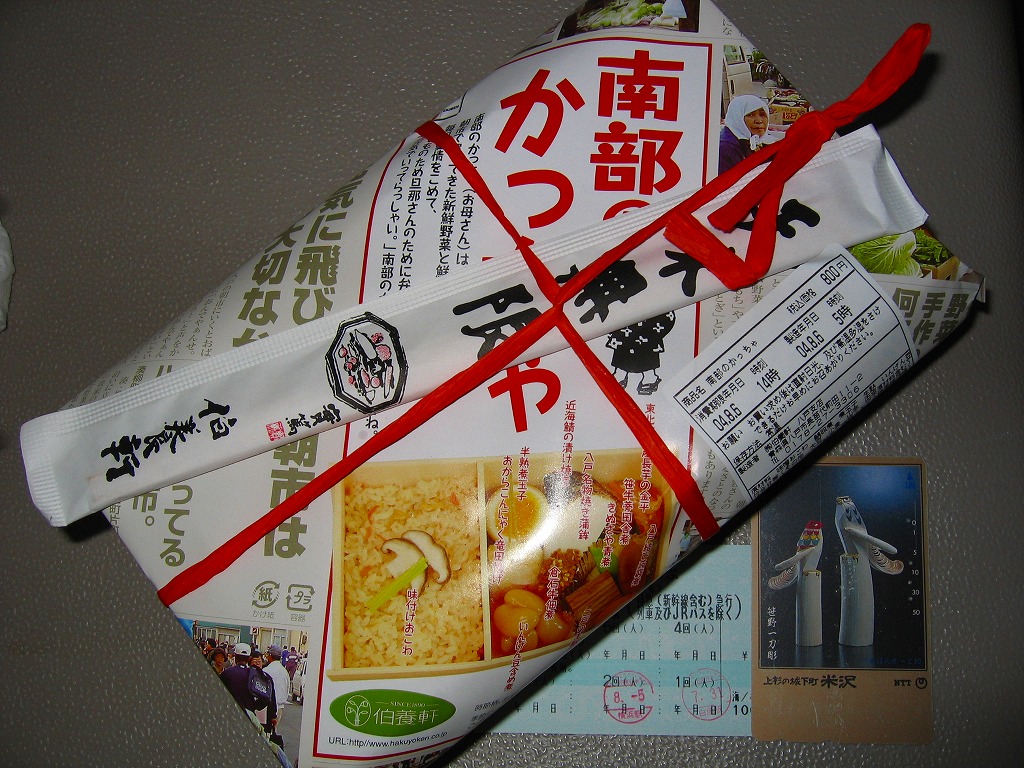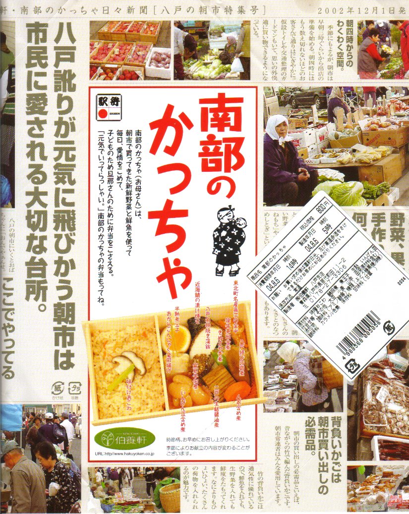 東北新幹線の八戸延伸に合わせて、2002(平成14)年12月1日に発売。平面は長方形、断面は六角形のユニークな形状のふた付容器を使用、フルカラー新聞風の掛紙で包み、紙ひもで割りばしごとしばる。