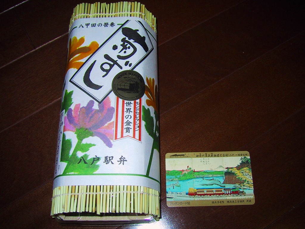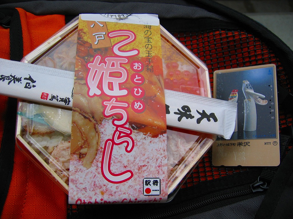 2003(平成15)年に発売か。正八角形の経木枠の容器に透明なふたをかけて掛紙代わりの紙帯で留める。中身は酢飯の上に、八戸近海やりいか姿煮、むつ湾産帆立旨煮、特製雲丹そぼろ、三陸いくら醤油漬、蟹甘酢漬が載るもの。同社他駅弁で見たような具に食べたような味で、新たな発見がない代わりに実績ある味に安心感がある。紙帯にお品書きがあるのに、それを巨大な食品表示ラベルで覆い隠してしまう姿も、同社の他の駅弁で見たような。