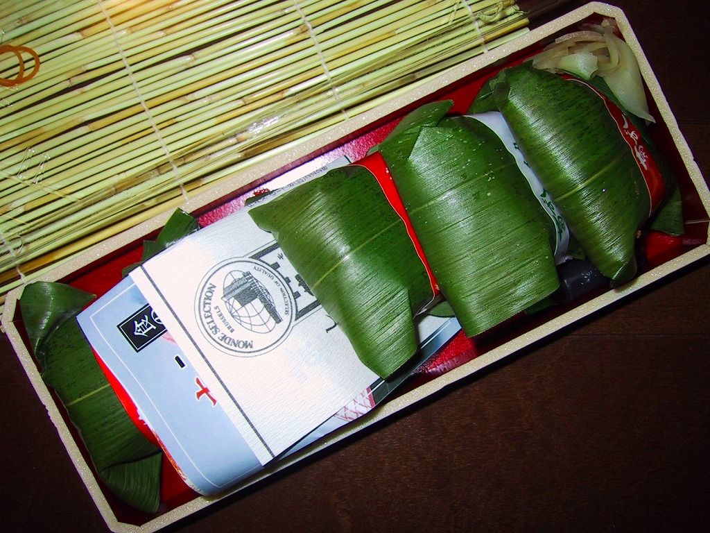 容器を竹籤で巻いて、菊を描いた掛紙でさらに巻く。その中には笹に包まれたうに・さけ・ほたて・いか・さばの5種類の笹寿司が1個ずつ入り、笹を取ると食用菊の花びらを、具の上に載せ酢飯の中にも均等に混ぜる中身が出てくる。食用菊そのものは味を主張しないため、口の中では何か異物が入る普通に美味い笹寿司でしかないが、見た目の美しさ、特にシャリの輝きは高級洋菓子のよう。