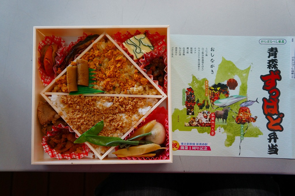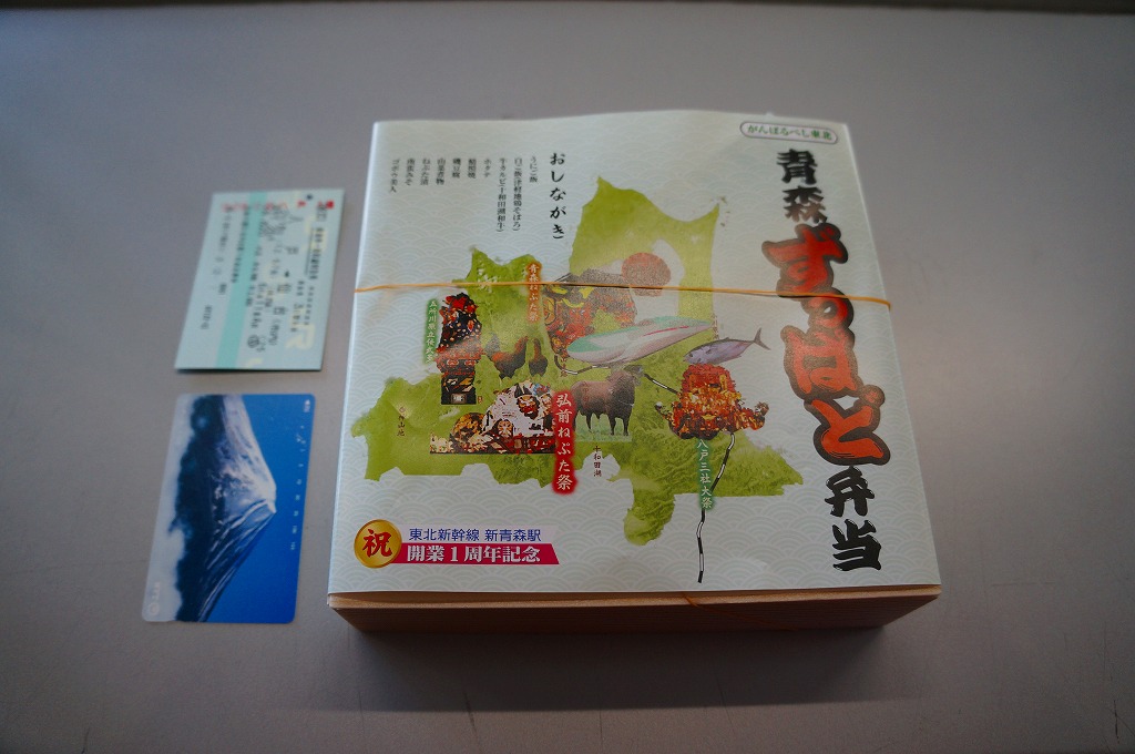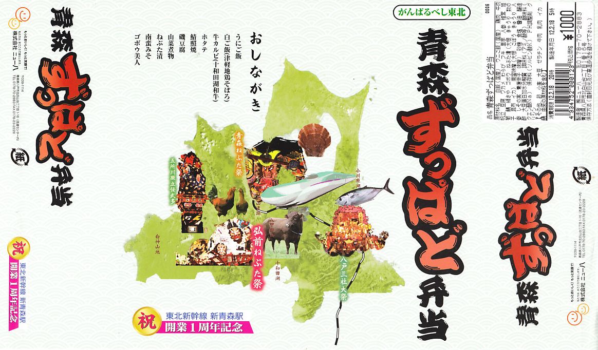 東北新幹線新青森開業1周年を記念して、2011(平成23)年12月に発売か。「ずっぱど」とは津軽弁で、いっぱい、たくさんという意味だそうな。正方形の容器に、青森県の形と3食材4祭にE5系新幹線電車などの写真と駅弁の名前などを描いた掛紙を巻く。