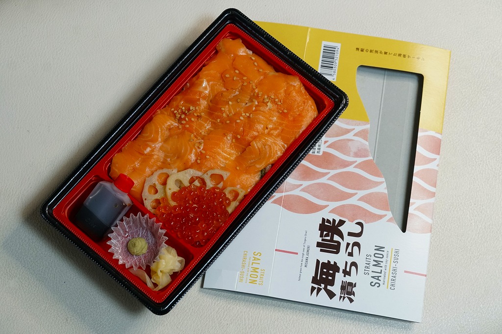 2021(令和3)年2月24日に八戸駅で発売。中身を少し見せたスリーブには、英文による「STRAITS SALMON marinated with sauce CHIRASHI-SUSHI」の訳文と「Salmon grew from the rough seas of Tsugaru Strait MISAWA,AOMORI」の宣伝文がみえる。中身は酢飯をサーモンで覆い、レンコンとイクラを添え、ガリとワサビとタレを付ける、とてもシンプルな内容。「海峡サーモン」の漬けは、スモークサーモンを思わせる香りと柔らかさ。駅弁でよくある焼鮭でない、まれにある鮭の押寿司にない、豊かな味わいが印象的。価格は2021年の発売時で1,300円、2024年時点で1,400円、2025年時点で1,530円。