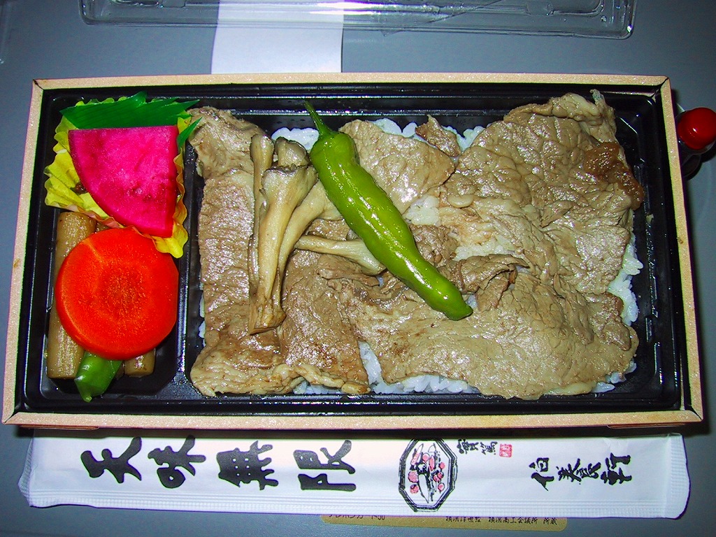 東北新幹線の八戸延伸に合わせて、2002(平成14)年12月1日に発売。長方形の容器に透明のふたをかけて掛紙を兼ねる帯で締める簡素な包装。中身は透けて見えるとおり、軽く味噌風味が付いた倉石牛が白御飯を覆い、柔らかいのに歯ごたえのある人参やゴボウの煮物が添えられるもの。