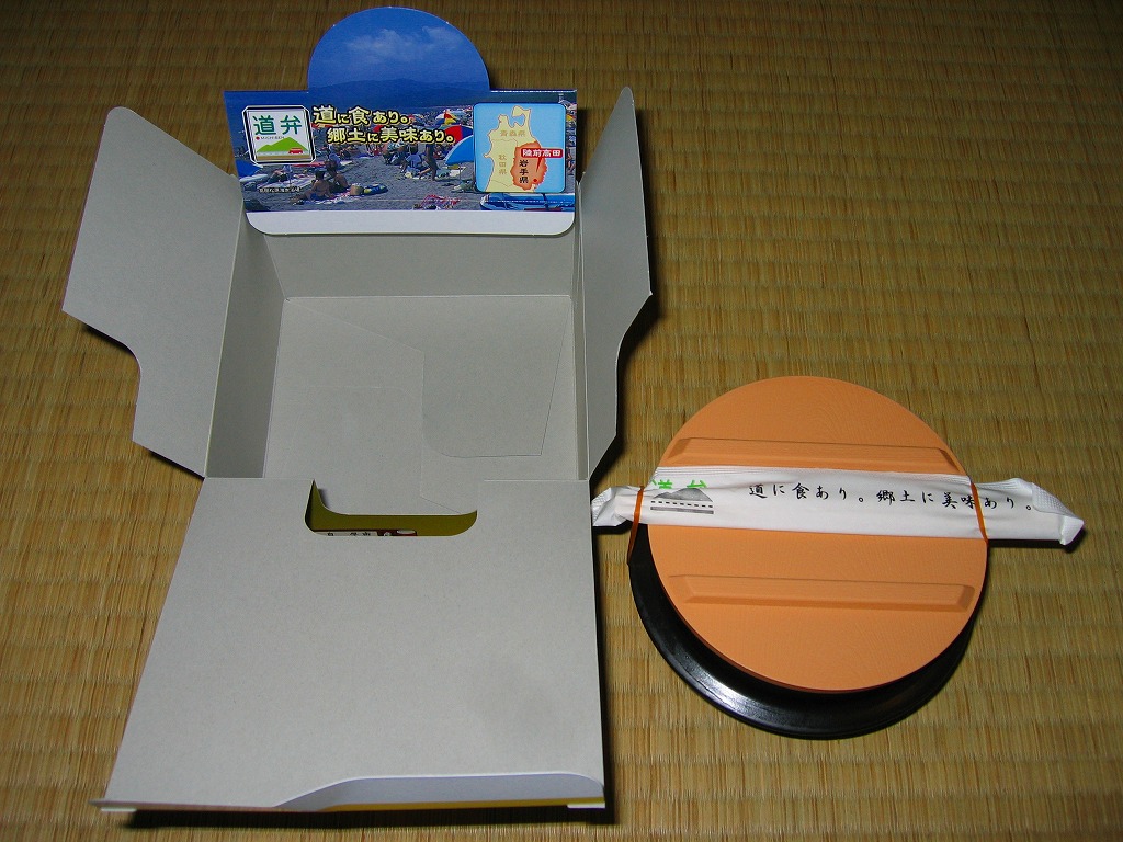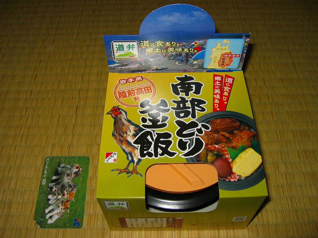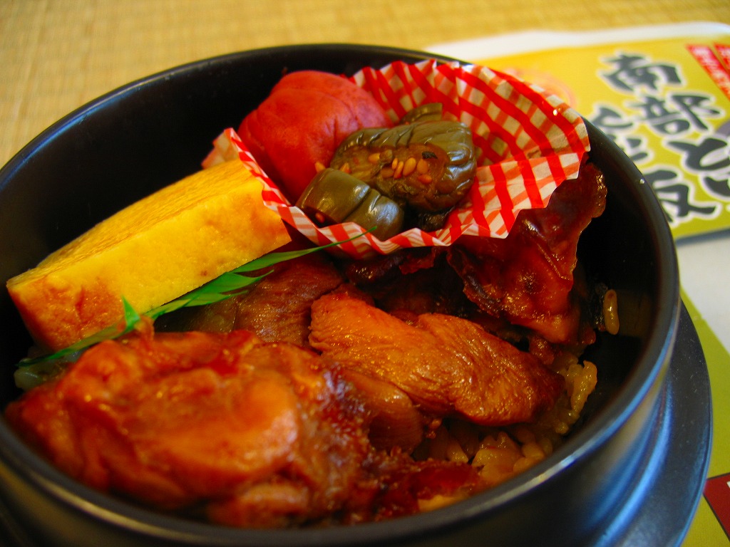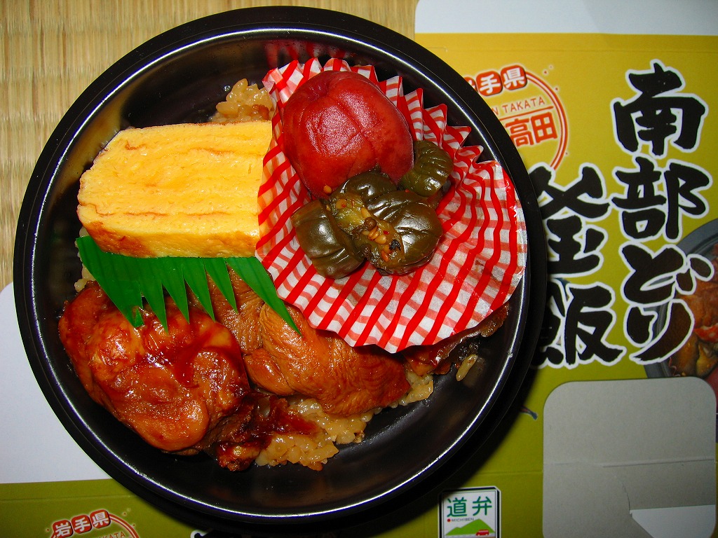 碁石のようなつやと重さを持つ、駅弁より小柄な釜飯型容器にプラスティックのふたをして、割りばしと輪ゴムでふたを留めて、スーパーやデパートの売り場での見栄えを重視した構造だと思える、立ち上がり付きのボール紙の枠に収める。中身は茶飯の上にごっつい鶏肉がごんごん置かれ、玉子焼や梅干しもサイズが大きな、少量なのにパワフルなお弁当。1シーズンのみの商品寿命か。