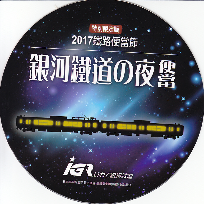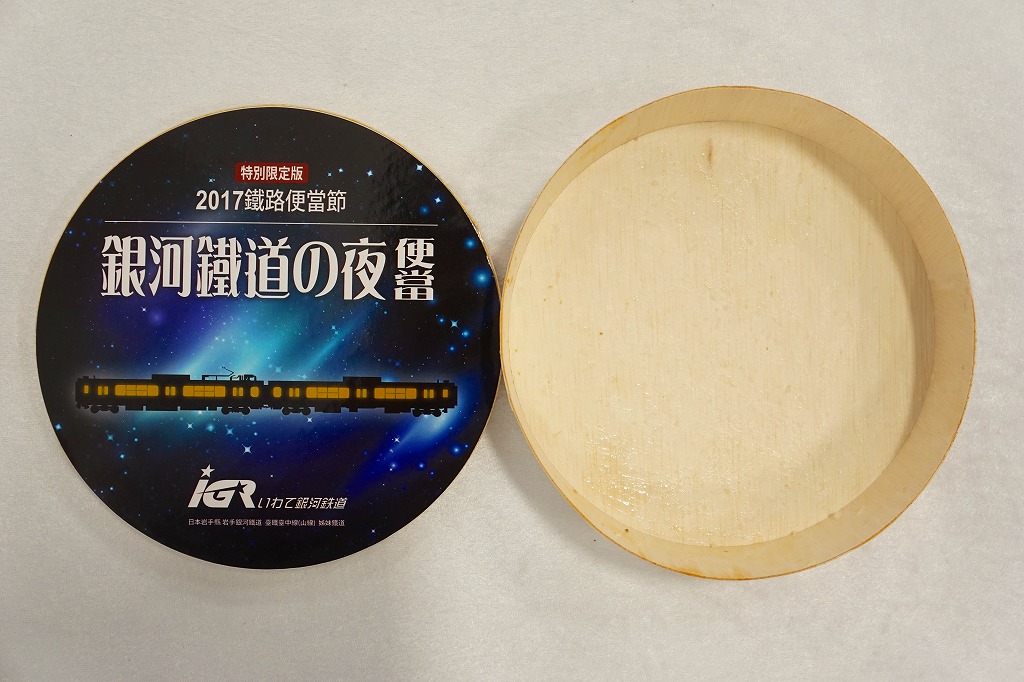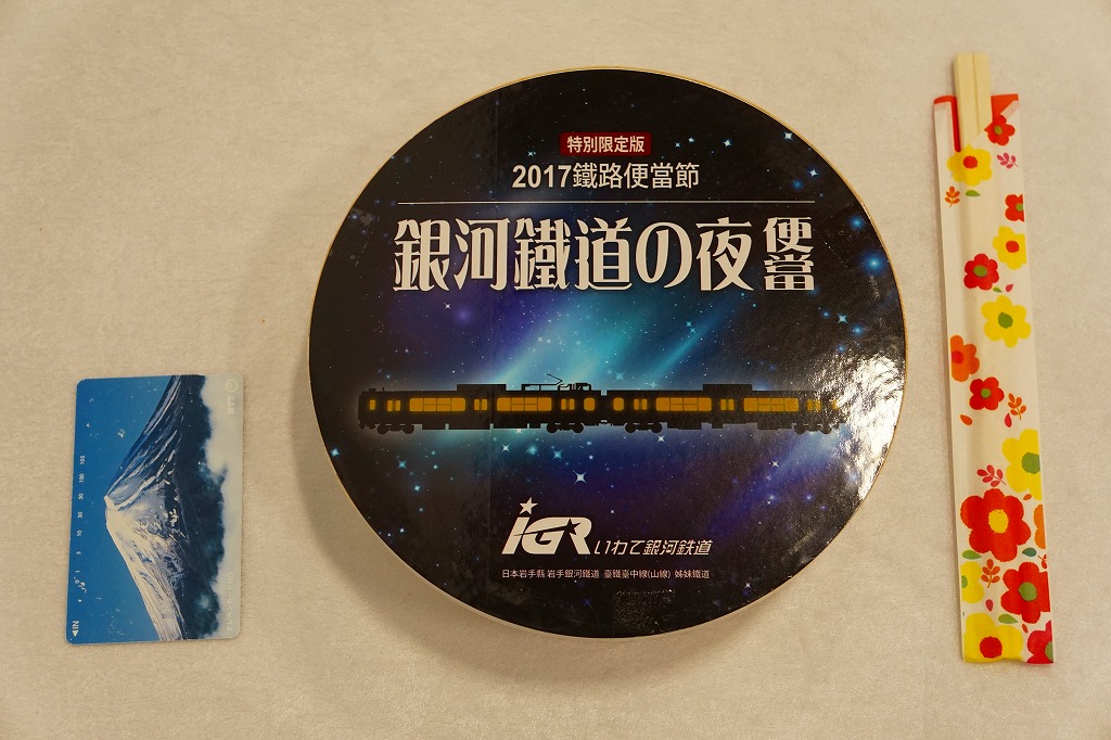 IGRいわて銀河鉄道の駅弁は、同社のIGR7000系電車が夜空を飛ぶ円形の容器に、酢飯を敷き、鶏肉、焼サバ、ごぼう煮、玉子焼、にんじん、たけのこ、きゅうり、しいたけ、れんこんなどを散らしたもの。ふたに「特別限定版 2017鐵路便當節」ともあるので、日本で売ることはないのだろう。IGRの「駅弁」はなかなか定着しないが、はたしてこのような駅弁の復活はあるのだろうか。
