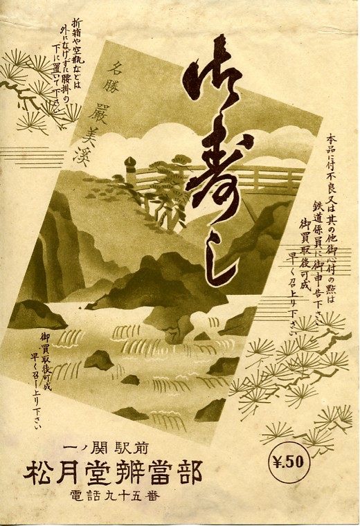 1950年代、昭和30年前後のものと思われる、昔の一ノ関駅弁の掛紙。掛紙に描かれる厳美渓(げんびけい)は一ノ関駅西方約8キロの磐井川にある名称天然記念物の渓谷で、道の駅やレストハウスなどがある地元限定の名所。近年の一ノ関駅弁の掛紙は隣町の平泉を取り上げることが多いが、これこそ正しい駅弁掛紙の姿かもしれない。