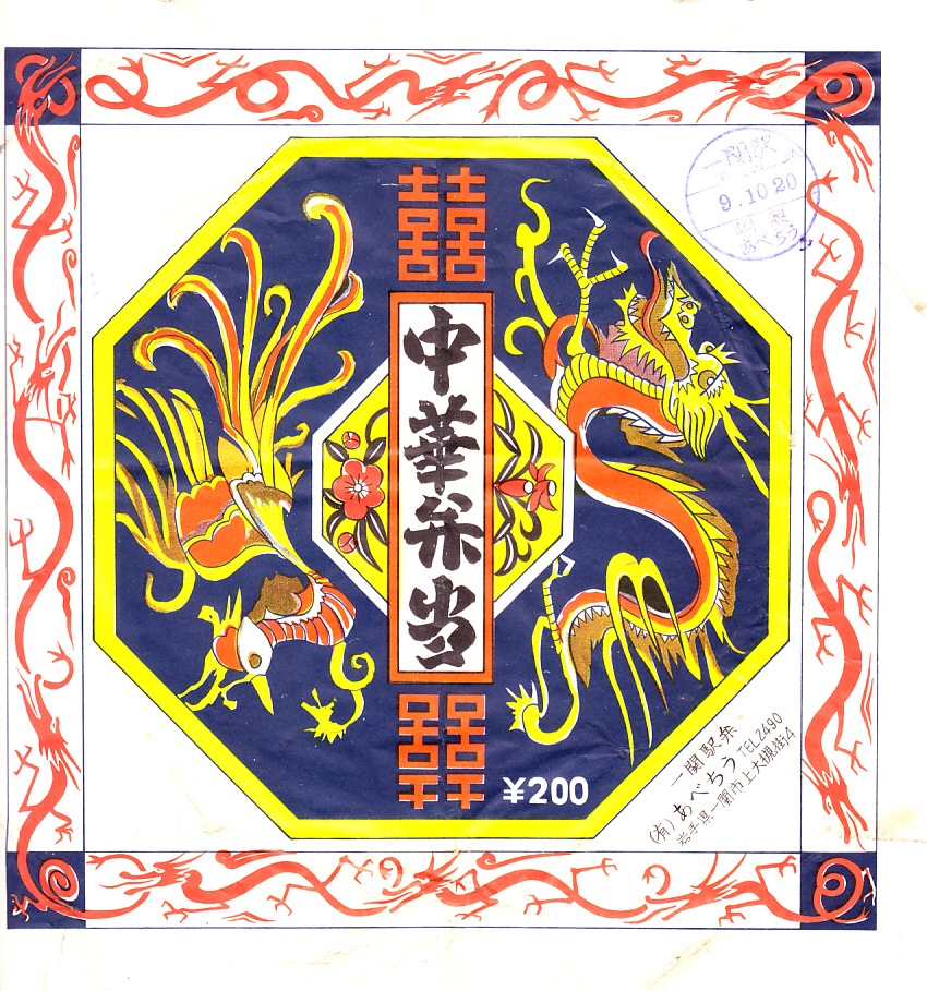 1963(昭和38)年9月10日20時の調製と思われる、昔の一ノ関駅弁の掛紙。縁起の良い八角形に、龍や鳳凰(ほうおう)や双喜紋(そうきもん)などで中華とわかる、ラーメンどんぶりのような手の込んだ絵柄。中華弁当という駅弁の存在が珍しい中、博多駅にも同じ雰囲気の掛紙があった。
