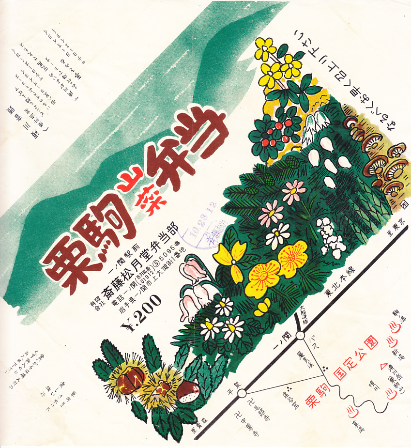 1970(昭和45)年10月23日12時の調製と思われる、昔の一ノ関駅弁の掛紙。クリやシイタケも描く栗駒高原の風景や、一ノ関や平泉の路線図を描き、須川音頭、注意書き、駅弁の名前と調製元を記す。山菜弁当も第二次大戦後の昭和時代に、そこそこ人気の駅弁だったと思う。