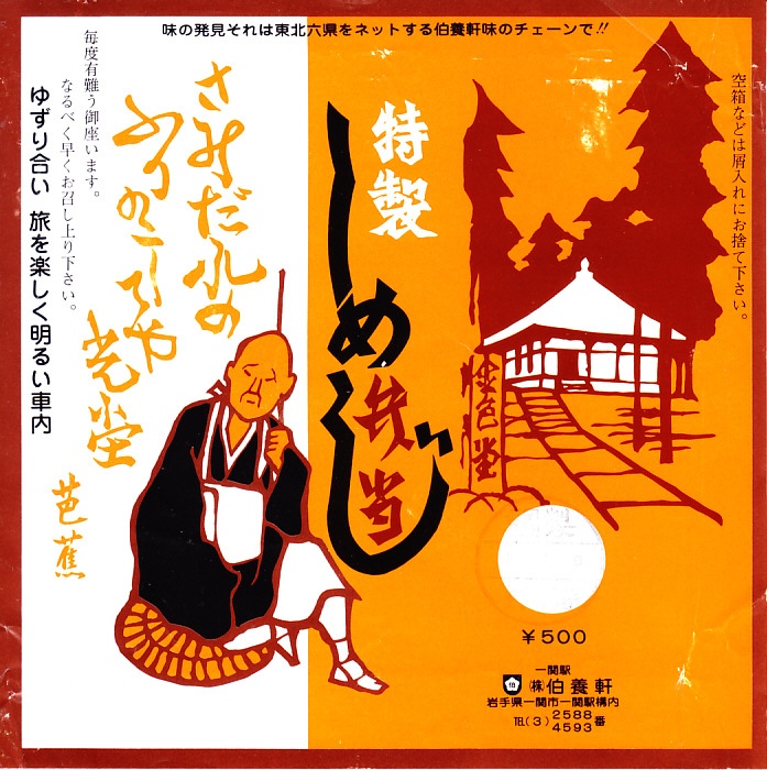 1980年代の調製と思われる、昔の一ノ関駅弁の掛紙。絵柄は平泉中尊寺金色堂にちなむものだろう。しめじを名乗る駅弁は珍しく、他には大月駅や鳥栖駅にあったくらいか。