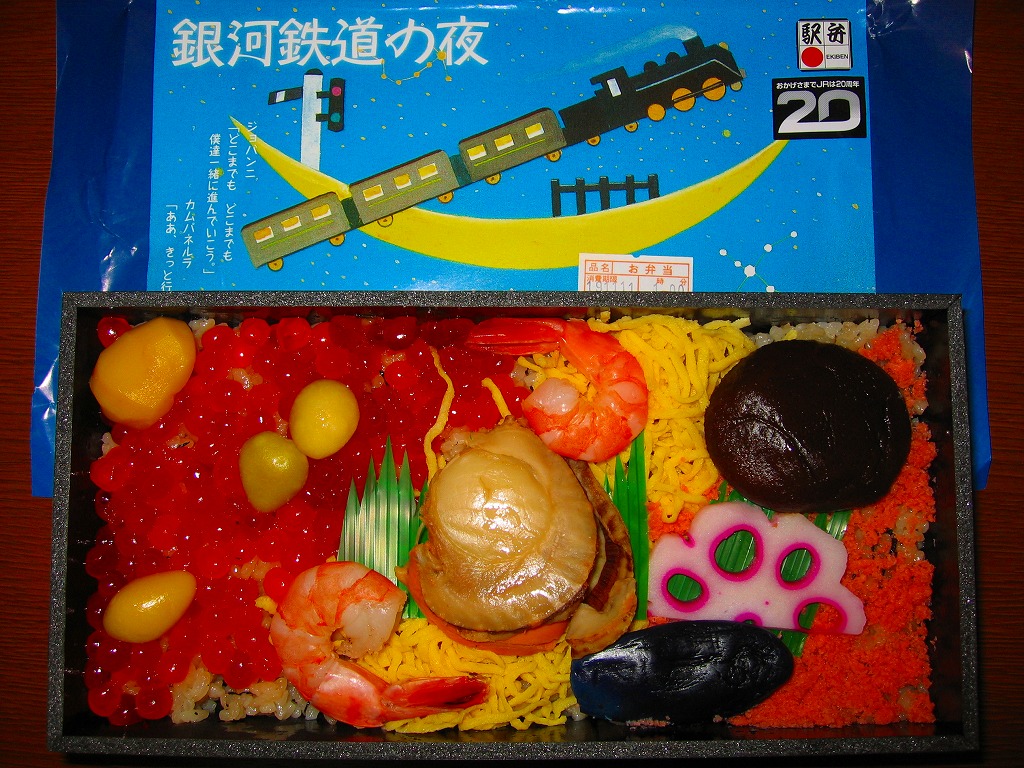 JR東日本会社発足20周年記念駅弁の一ノ関駅あべちう版として、2007(平成19)年の秋までに発売。とはいえ、その構造や中身は、花巻駅の駅弁「ロマン銀河鉄道SL弁当」にとても似ている。