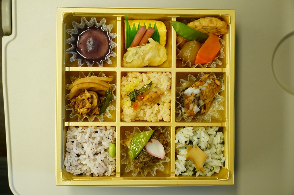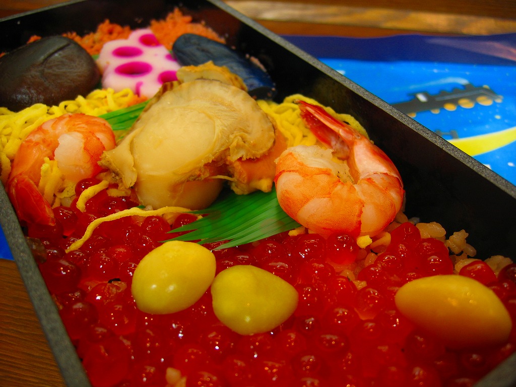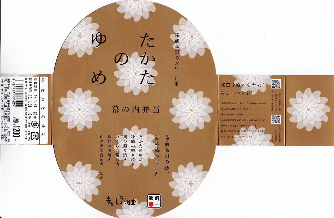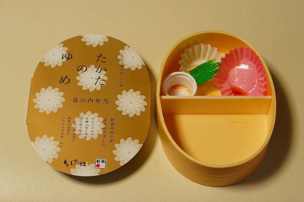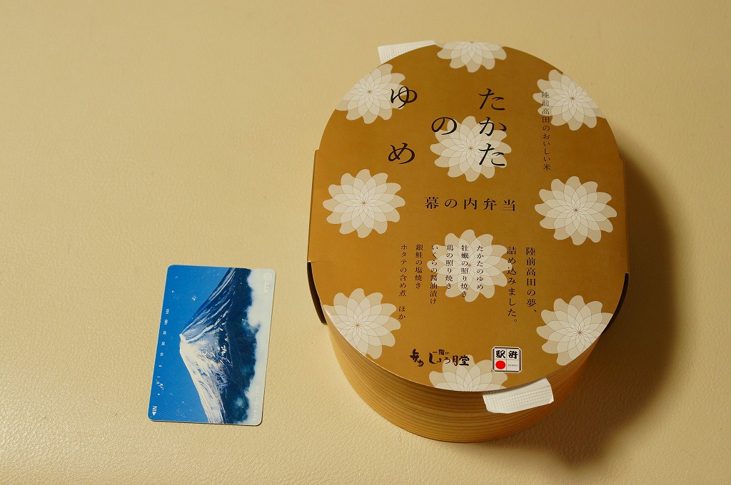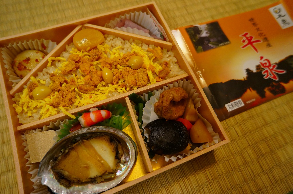 2011(平成23)年7月頃の発売か。金色の正方形の容器に、平泉の風景写真を印刷した掛紙を巻く。中身はウニと錦糸卵とクリとギンナンで金色の御飯に、アワビ煮、エビや菜の花などの酢の物、ごま寒天、しいたけやがんもどきなどの煮物、鶏もち、大根桜漬など。御飯とその仕切りで金色堂をイメージしたという。黄色というか茶色というか金色が勝る単色のお弁当は、味も見栄えも掛紙も、ふんわりよくできていると思った。価格は2011年の発売時や購入時で1,300円、2016年時点で1,400円。