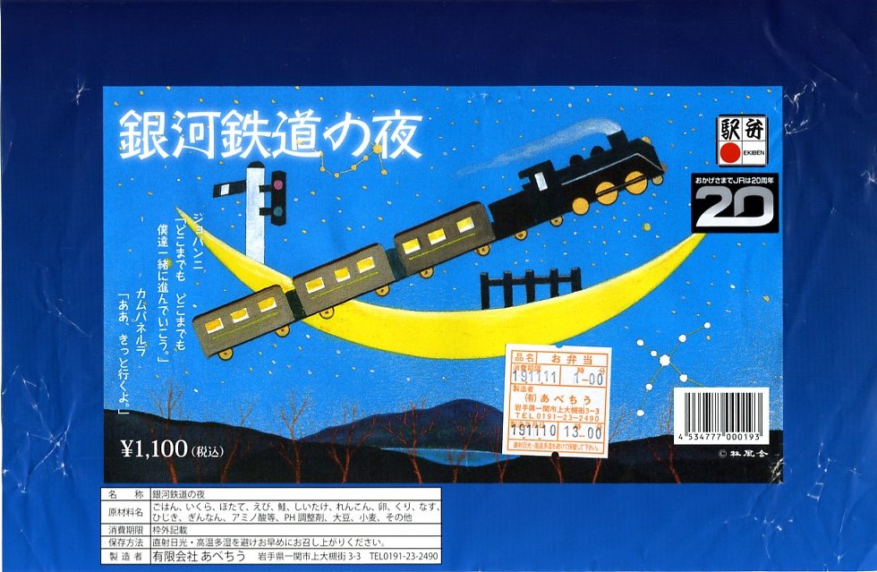詩人で童話作家で農業指導者でもあった宮沢賢治の、童話の代表作のひとつである「銀河鉄道の夜」は、生前に発表されず没後に草稿の形で残されたもの。こうやって駅弁になったり、この作品できっと参考にされたはずと岩手軽便鉄道の後進であるJR釜石線に「銀河ドリームライン」の愛称が付いたり、東北新幹線並行在来線の第3セクター鉄道に「IGRいわて銀河鉄道」の社名が付いたり、現在に実在する鉄道とも縁の深い作品である。