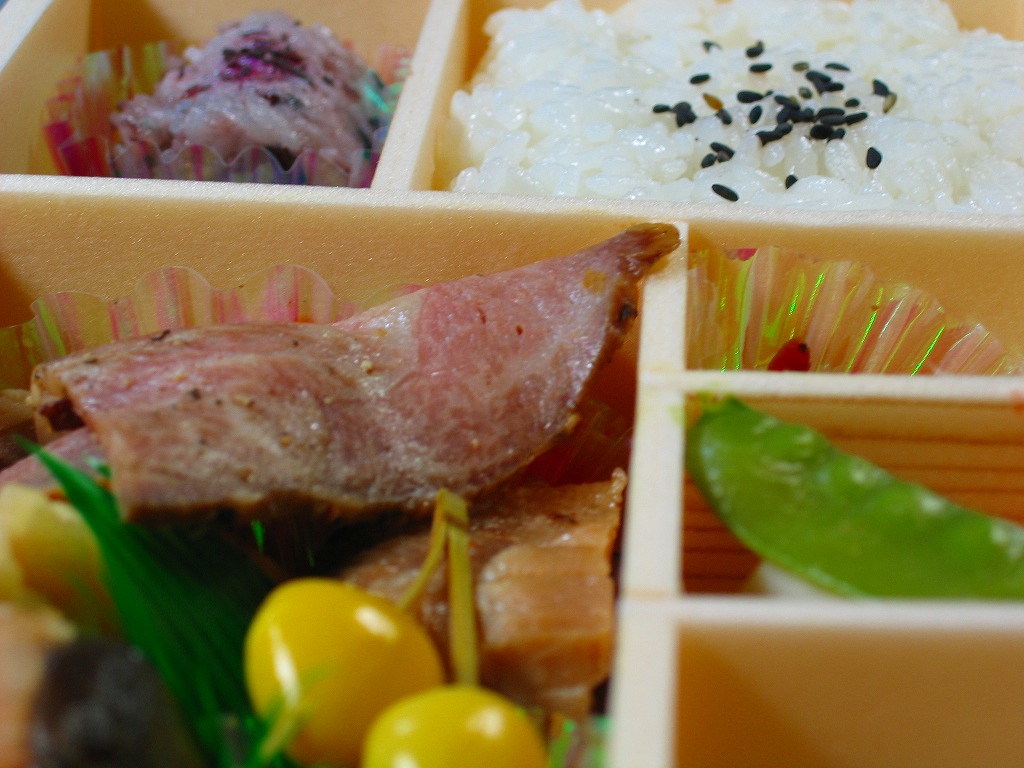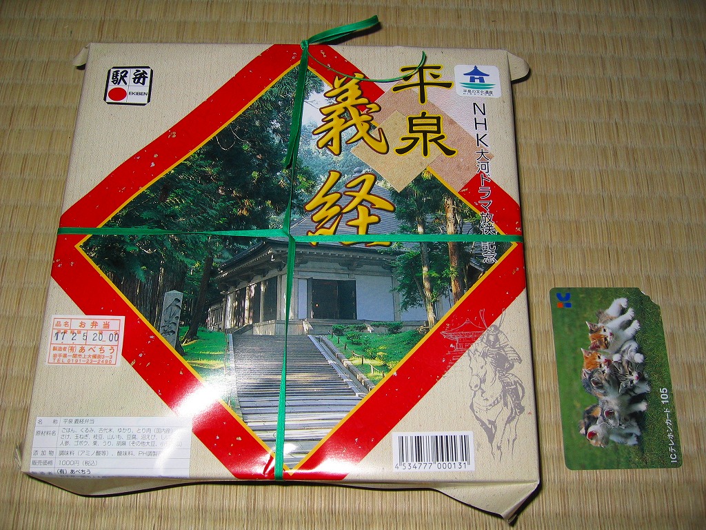 2005(平成17)年のNHK大河ドラマ「義経」放送に合わせて発売か。長方形の容器に木目調の紙のふたをかけ、お品書きと割り箸をのせて、平泉の春の藤原祭りの写真を印刷した掛紙で包んで赤い紙ひもでしばる。中身は古代米の俵飯に白御飯、霜降り具合が見える前沢牛ローストビーフ、他にサンマ昆布巻やホタテ甘辛煮や海老天や鶏照焼に煮物各種などと、デザートのミニおはぎ。