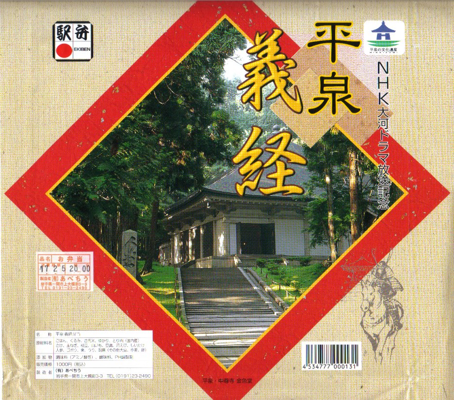 2005(平成17)年のNHK大河ドラマ「義経」放送に伴い、2004年9月22日に発売。大きな正方形の木目調容器にお品書きと割り箸を添えて、中尊寺金色堂、正確には金色堂を覆い保護する建物の写真を載せた大きな掛紙をかけて紙ひもでしばる。中身は古代米御飯とくるみごはん、鶏照焼に鮭唐揚、きじ風もちに枝豆揚に煮物や漬物など。