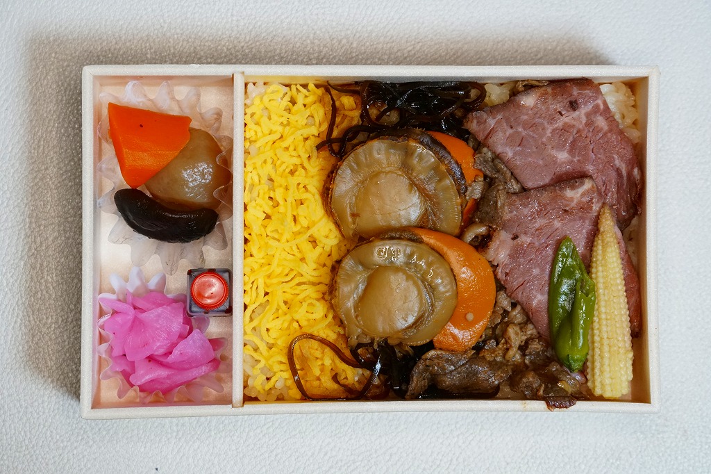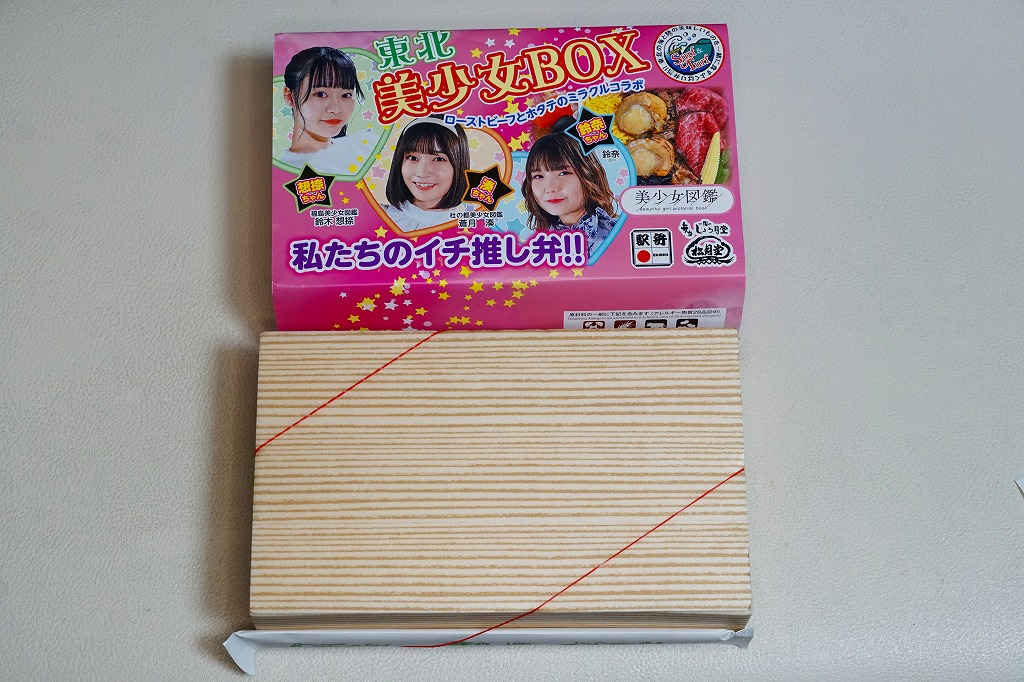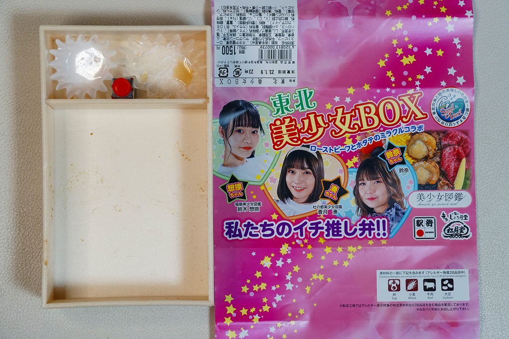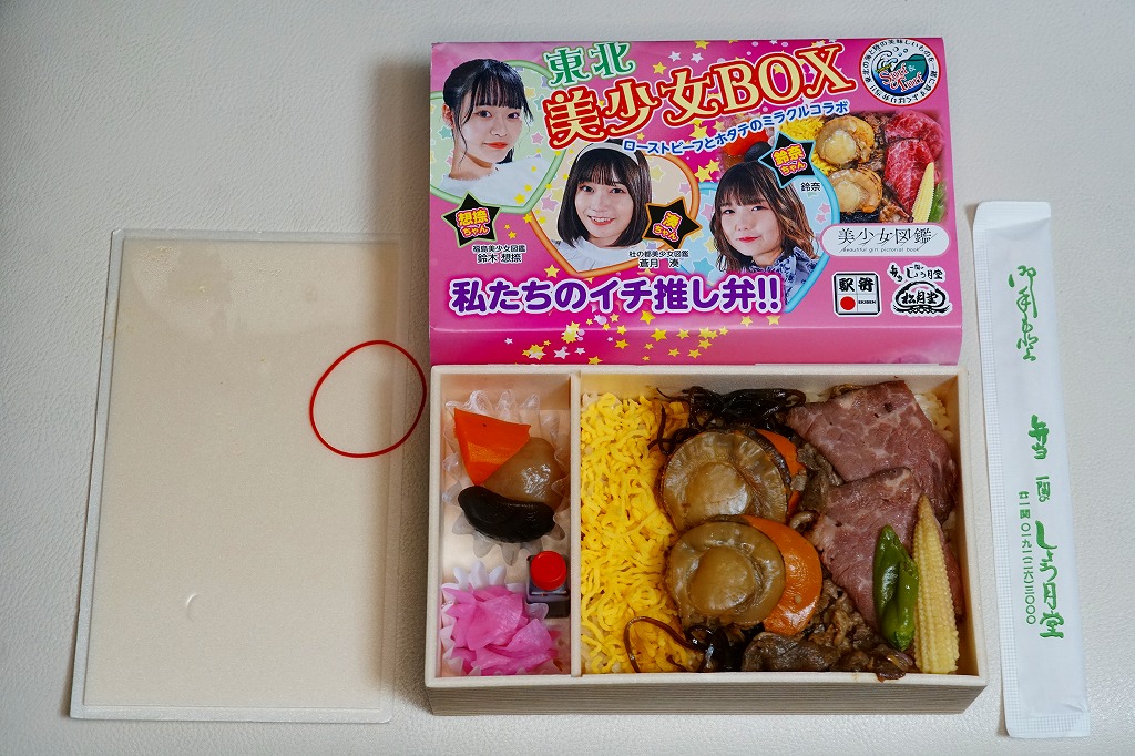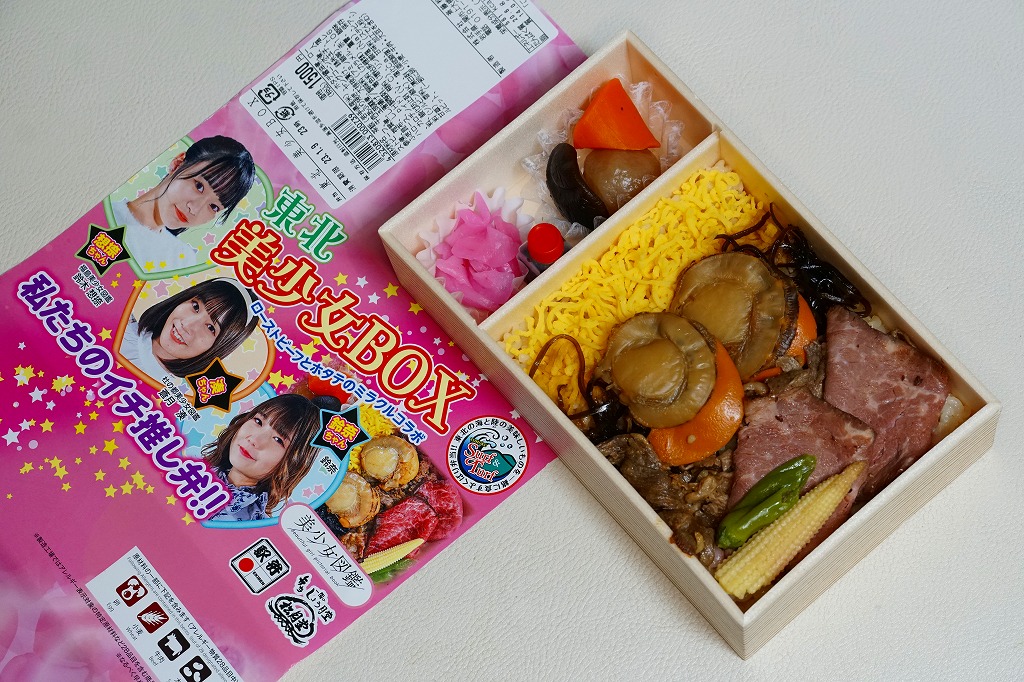 「東北美少女BOX」「ローストビーフとホタテのミラクルコラボ」「私たちのイチ推し弁!!」と様々なアイコンを記すピンク色の掛紙には、女性3名の顔写真と中身のイメージ写真を載せる。中身は茶飯をホタテの醤油煮2個、ローストビーフ、牛肉のあぶり焼き、昆布、錦糸卵で覆い、ヤングコーン、ししとう、煮物、大根桜漬を添えるもの。今回販売された4種の商品のうち、これが掛紙も中身も最も作り込まれた印象で、本気度が伝わってくる気がした。駅で売られて地元紙で紹介されるようなことが、あってよいと思う。