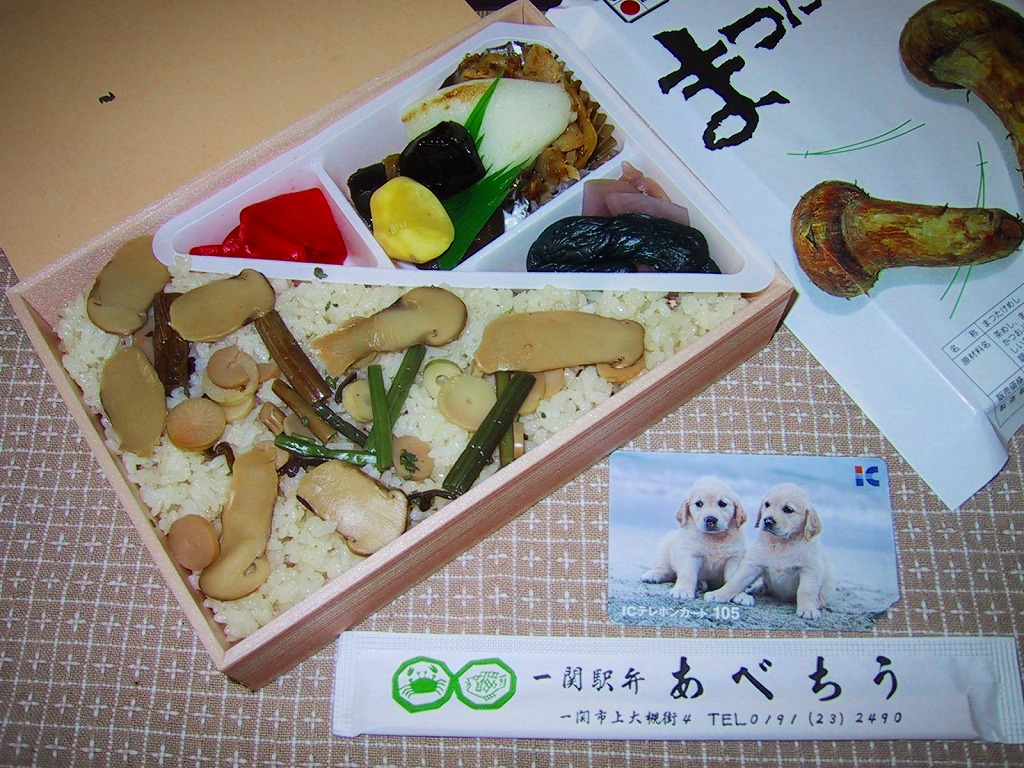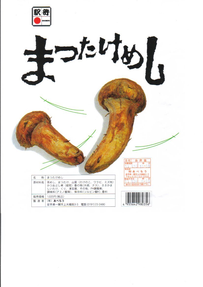 1976(昭和51)年の発売か。秋冬のスーパーやデパートの駅弁大会でよく見かけた駅弁。松茸を描いた掛紙がかかる長方形の容器を使用、松茸で炊いた御飯の上に、小ぶりなスライス松茸が多数、無造作に散りばめられる。2010年より前に終売か。