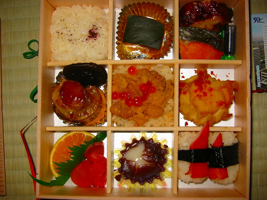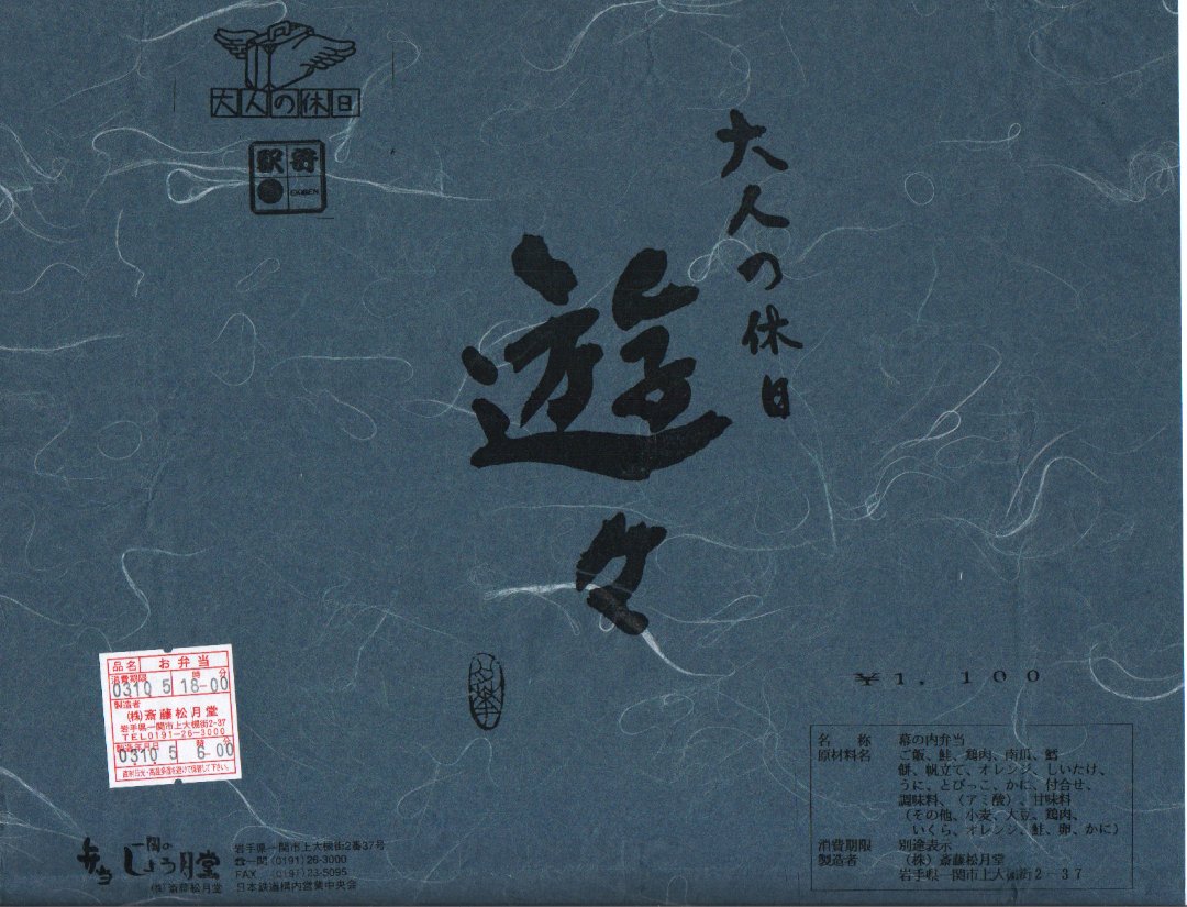 2002(平成14)年の春頃に発売された、JR東日本「大人の休日」駅弁の、一ノ関駅の斎藤松月堂バージョン。大きな藍色の和風紙を掛紙と、容器のふたに載るお品書きは手書き墨字のコピーで、食べる前から味わい深い。9つの区画に分割された中身は、岩手産ひとめぼれのうにめし・カニカマ俵飯・しそ載り御飯で3区画、岩手県産の焼鮭・鶏照焼・煮カボチャ・タラすり身包み揚げ・帆立で4区画、デザートのミカンと一関名物あんこもちで2区画。容器が経木ならという贅沢な要求くらいしか出てこない秀作。2004年頃までの販売か。